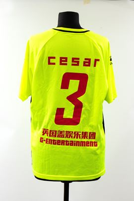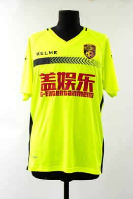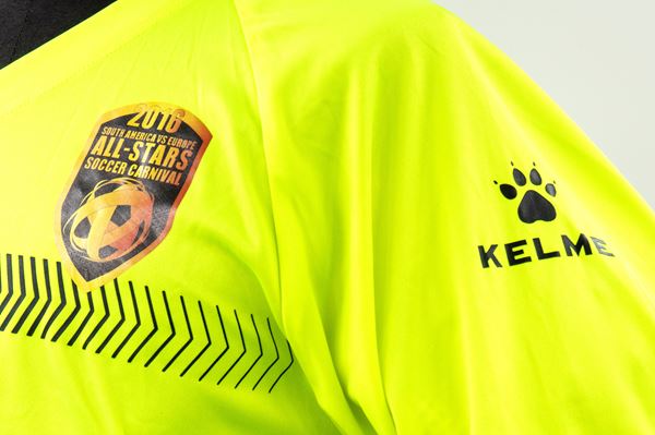Match jersey for the "South America vs. Europe ALL STARS SOCCER CARNIVAL" soccer match played in 2016 in Chongqing, China, between two teams featuring former European and South American stars. Yellow, short-sleeved jersey.