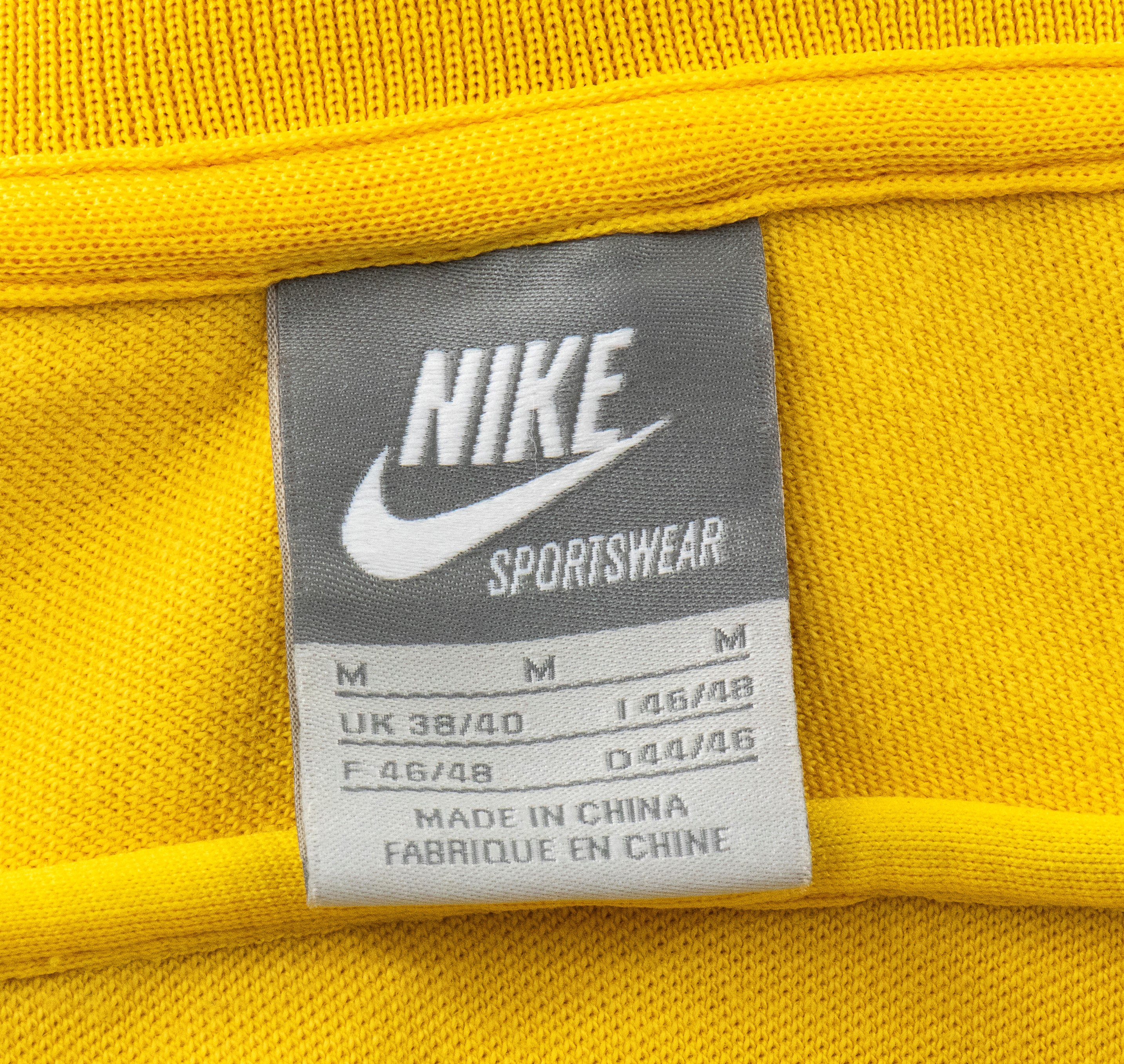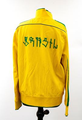 BRAZIL training/retirement sweatshirt. NIKE jacket, yellow/gold with green trim, long sleeves, two side pockets, double center zip. Internal labels made in China, size M