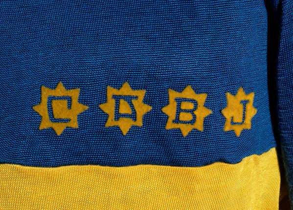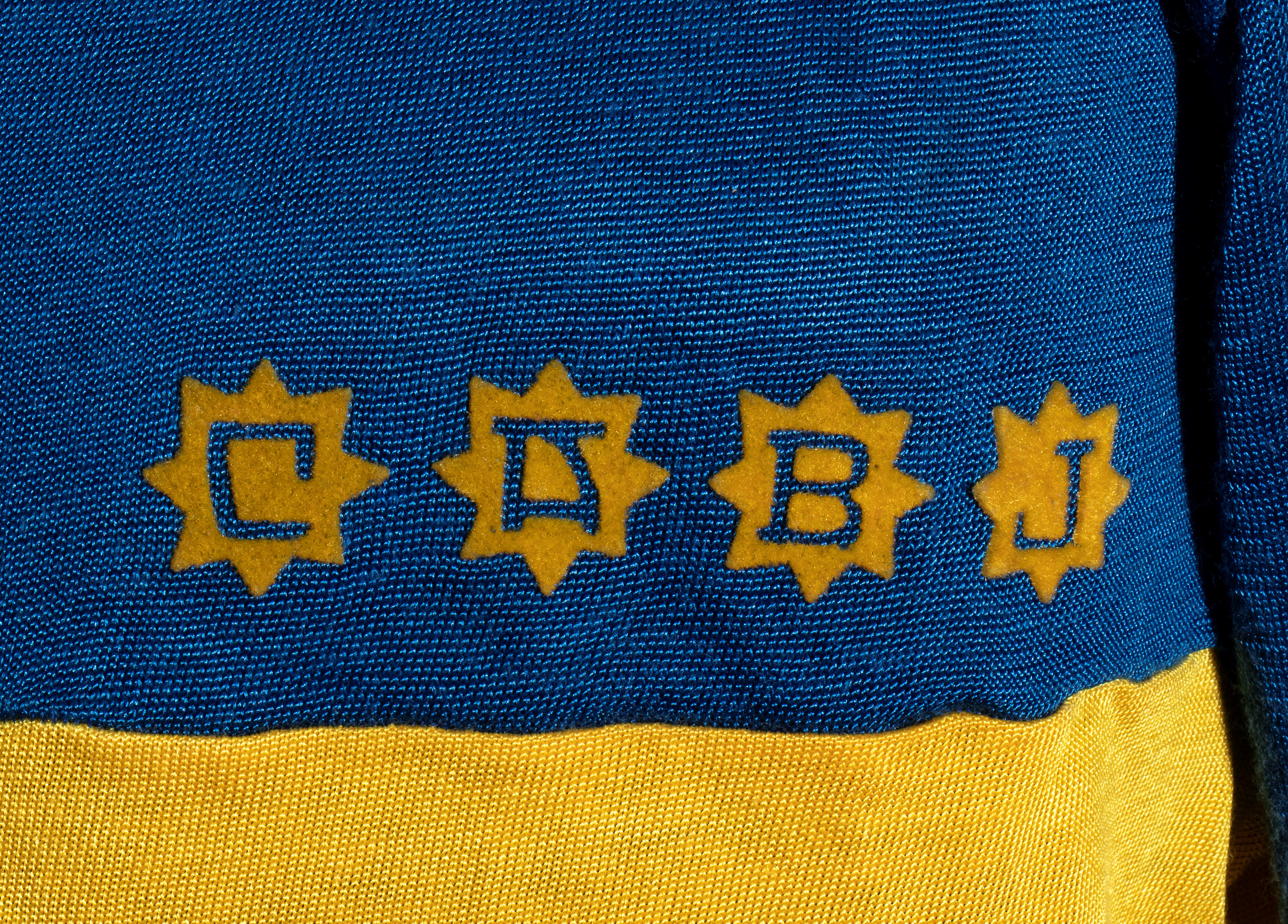 Boca Juniors (Club Atletico Boca Juniors) home jersey, 1981-82 season, blue with a yellow horizontal band, long sleeves with yellow piping from the collar to the cuff.
