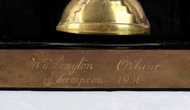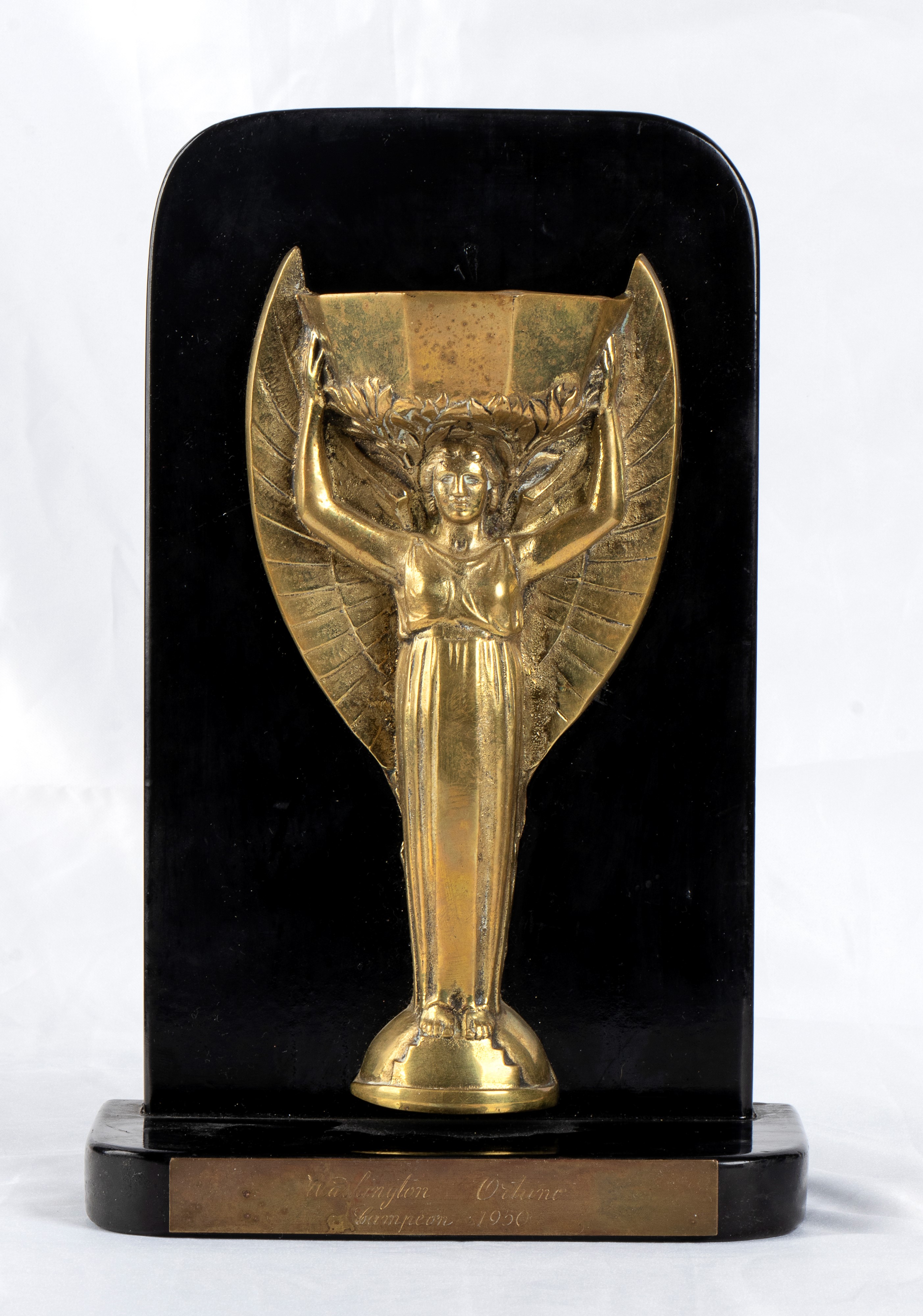 This trophy belonged to Washington OrtuΓ±o (Montevideo, May 13, 1928 – September 15, 1973), a Uruguayan footballer, as indicated on the plaque attached to the base. It is the same size as the original cup, reproduced in half-circle, and is extremely rare, considering that the Rimet Cup has been discontinued since 1970 and has been replaced by the current FIFA trophy.