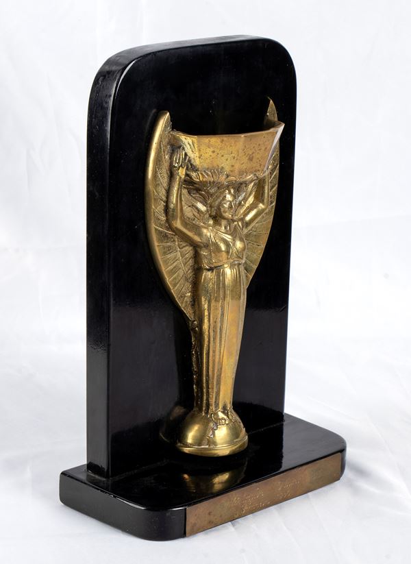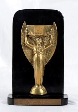 Trophy made of bronze, mounted on a wooden stand, awarded to each player and staff member of the URUGUAY team (World Cup winners in 1930 and 1950).