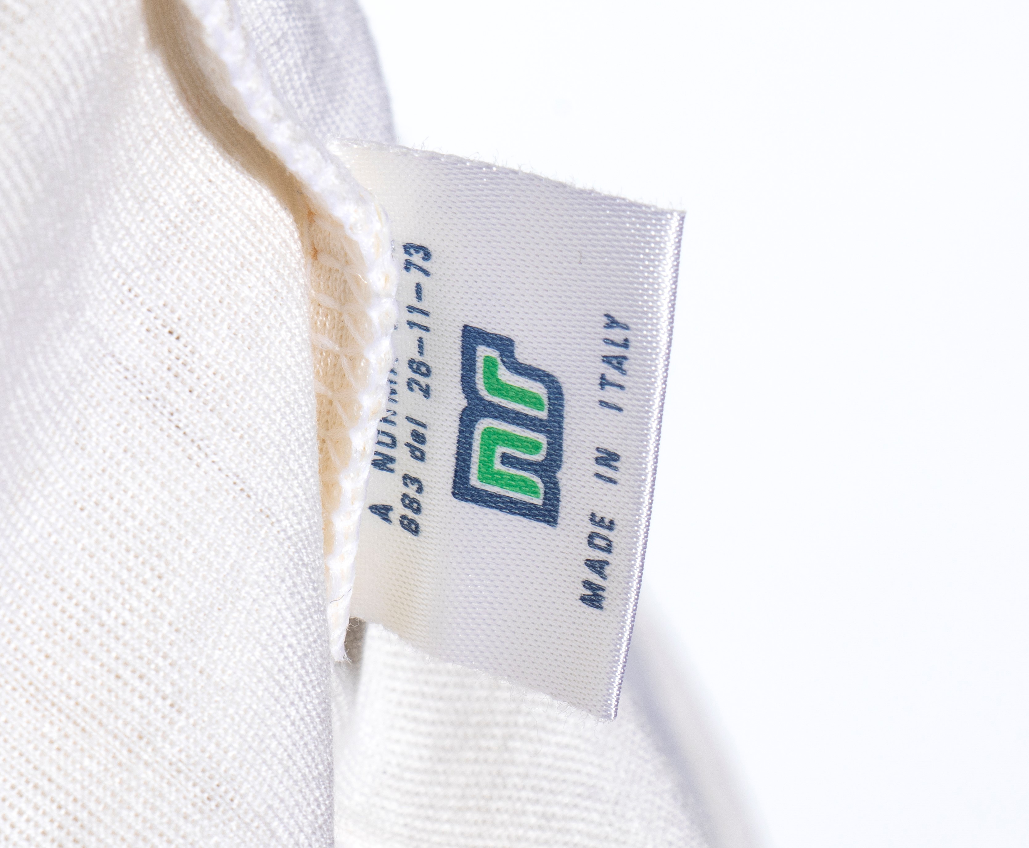 COSMOS short-sleeved jersey, white, ENNEERRE acrylic. Blue collar with yellow trim. Inside label: "According to Law 883 of 26-11-73 NR Made in Italy"