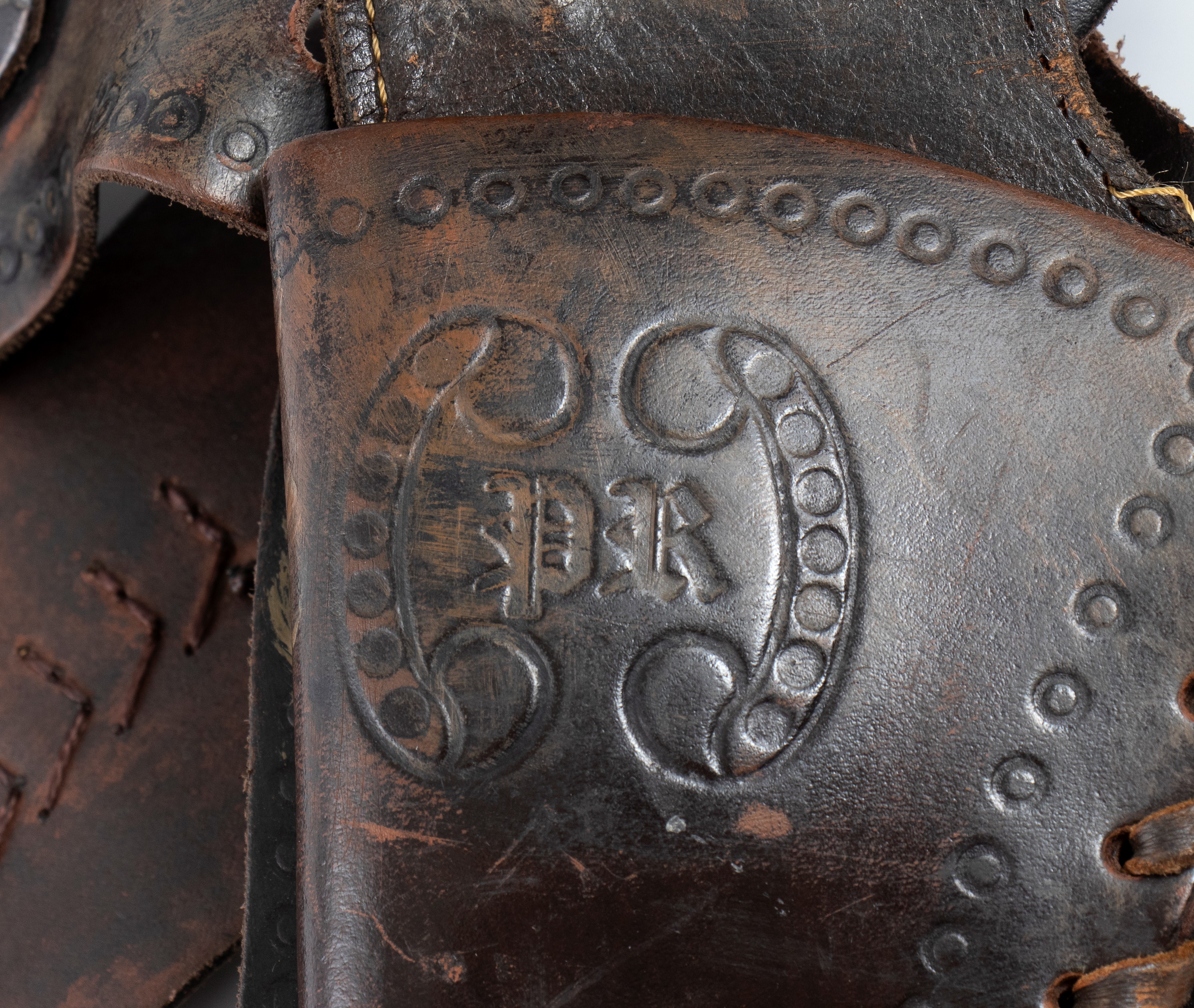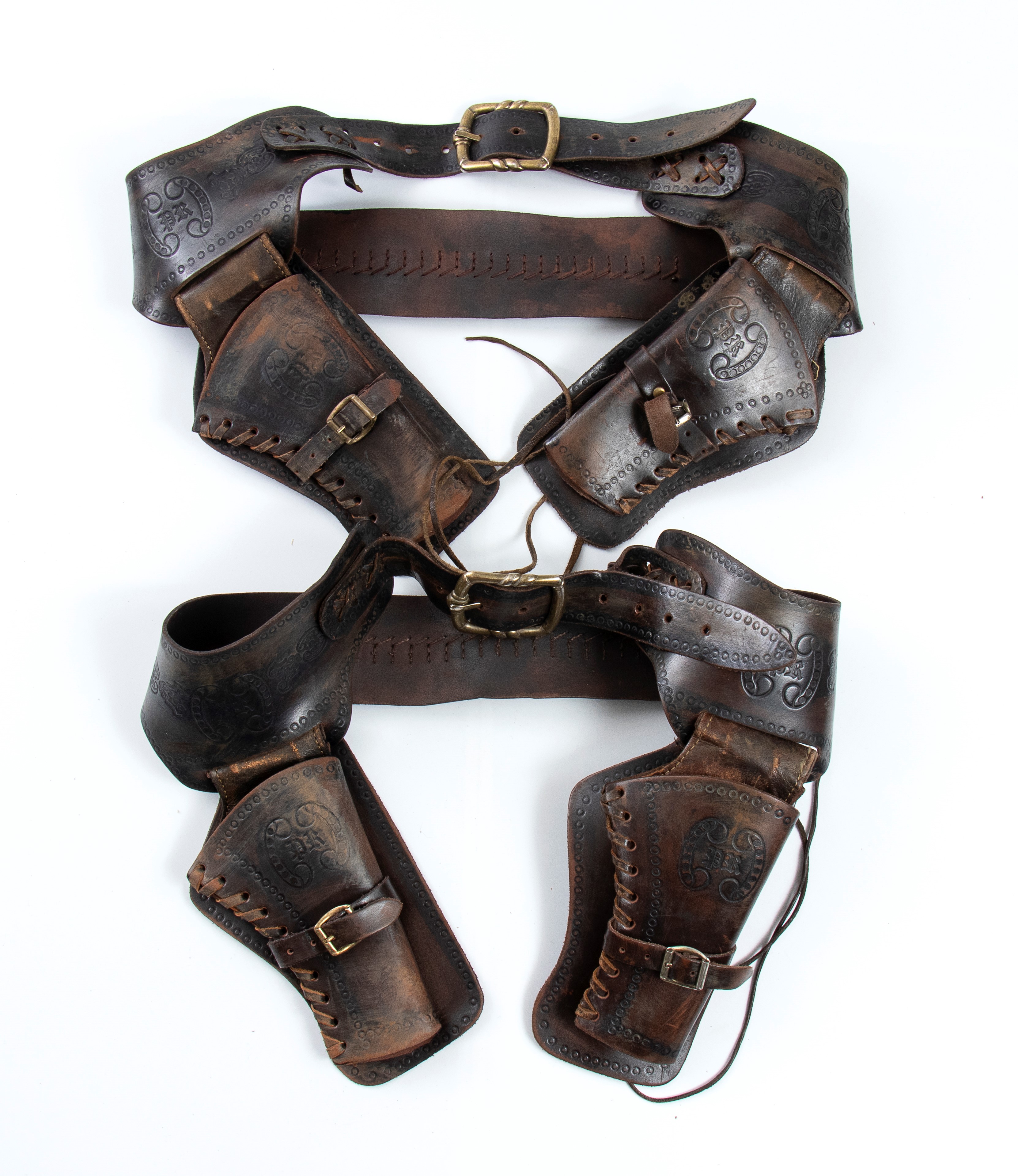 Pair of leather gun belts, each with two side holsters, with embossed ornamental designs and the initials PR, presumably used for filming.