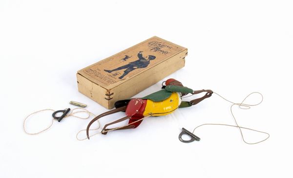 Lithographed tin monkey, version with jacket covered in paint to simulate fabric. Fez with bow. Rope with tin rings and ring stop plate marked LEHMANN. Original box. LEHMANN EPL 385, circa 1905-1920