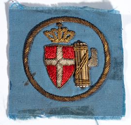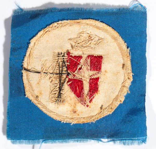 Emblem embroidered directly onto a strip of blue fabric for application to the athlete's blue jersey. Made of silk thread and gold and silver braid embroidery, it features the fasces and the Savoy shield. From the twenty-year Fascist era, original, measures approximately 80 x 80 mm, in excellent condition.