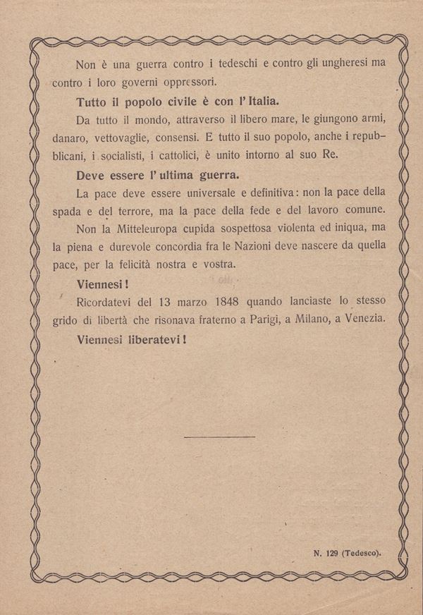 Original of one of the leaflets (model 129) dropped on Vienna on 9 August 1918 by the 7 aircraft of the "La Serenissima" squadron led by Gabriele d'Annunzio. It measures 16x23.5 cm and is in excellent condition. Flyer on paper, double sided. This is the flyer with the text translated into Italian