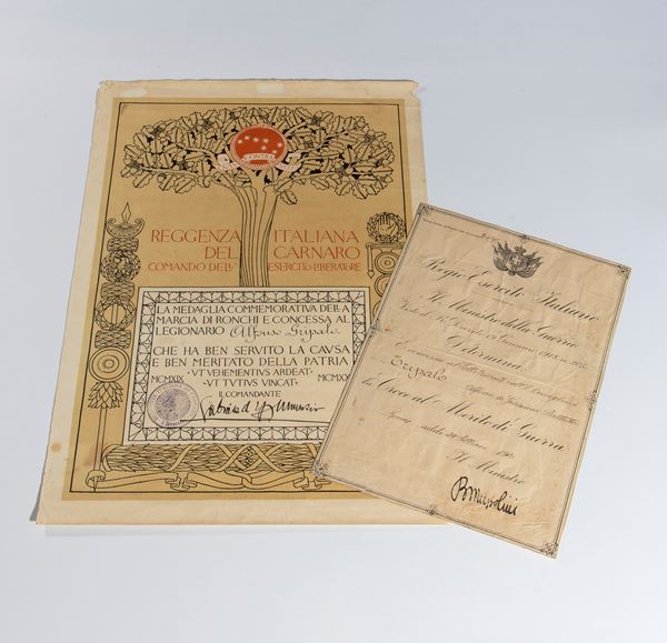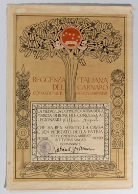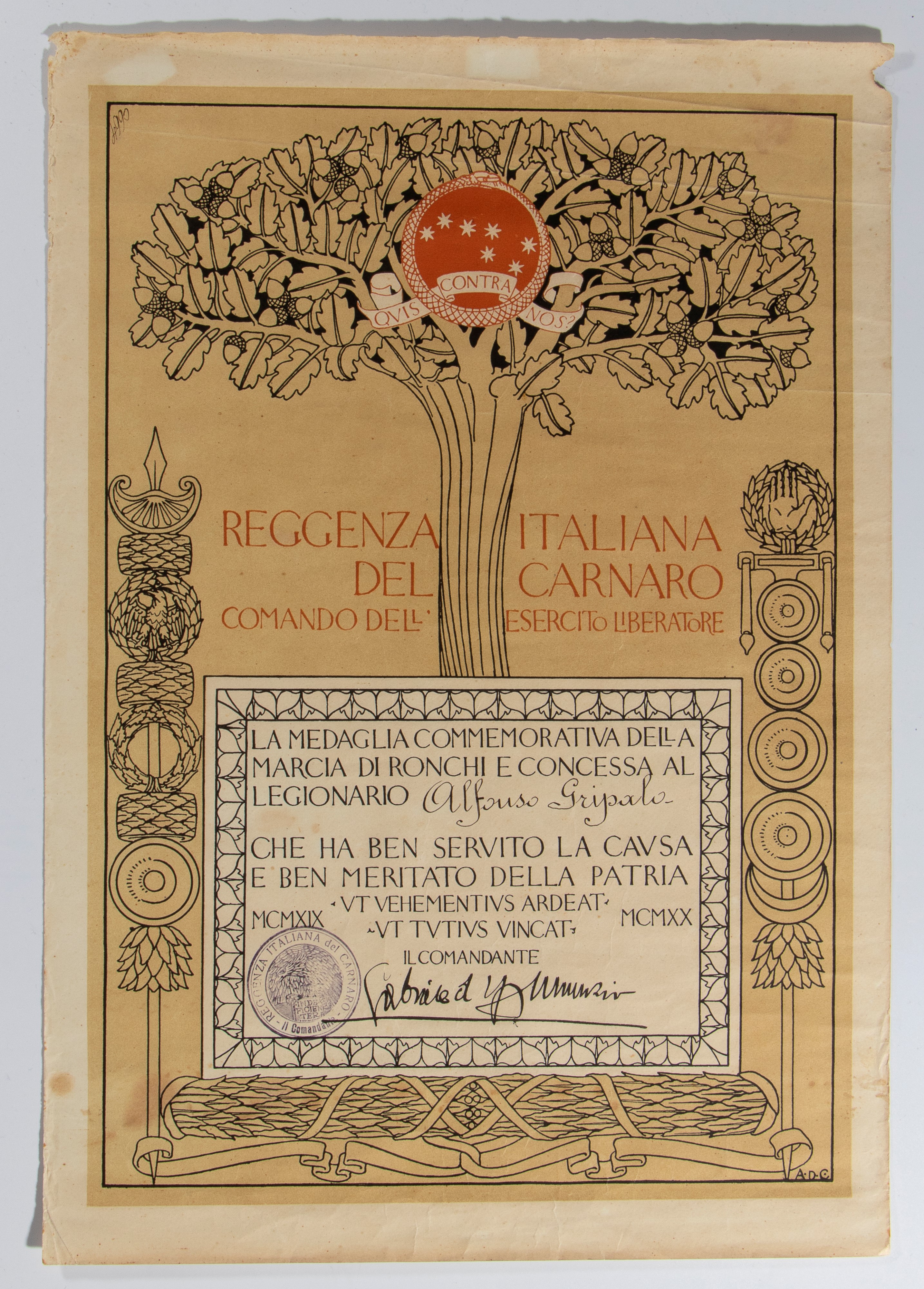 Numbered top left, stamped signature of Gabriele d'Annunzio, circular stamp of the ITALIAN REGENCY OF CARNARO - THE COMMANDER.