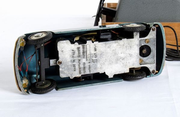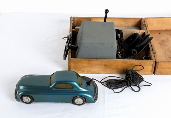 Ferrari 166 Touring, metallic blue colour, produced by DOMO, rare electric version with electric lights, wire-controlled. Marked DO.MO. Made in Italy Patented, Serial number n. 544, Cat 501/1. In original wooden box, with control station, small handwheel, extension cords and electric cable. In excellent condition. Not tested
