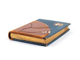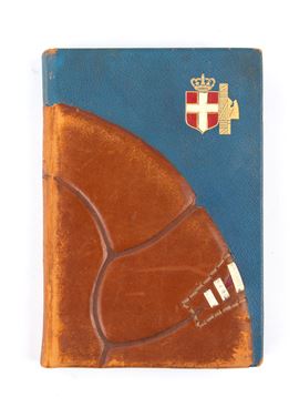 Hard cardboard cover, covered in blue imitation leather, with a spectacular embossed genuine leather design of a stitched football (typical of the era), embellished in the top right corner with the crowned Savoy shield with a white cross on a red background, flanked by a fasces embossed in imitation gold, reproducing the crest of the Italian national football team, which was worn sewn to the chest of the jerseys and uniforms of the players and members of the national team staff. The book's title is printed vertically in gold-tone lettering on the spine.