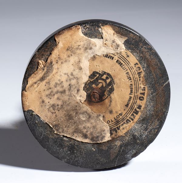 A bronze fasces in the round, mounted on a marble base, with the remains of a cartouche applied to the base, which, if complete, would read "NATIONAL COMMITTEE FOR THE MONUMENTAL CEMETERY OF GRAPPA - UNDER THE HIGH PATRONAGE OF HIS MARY THE KING - Fascio Littorio Sales Section - Naples, Via Torino 48"
