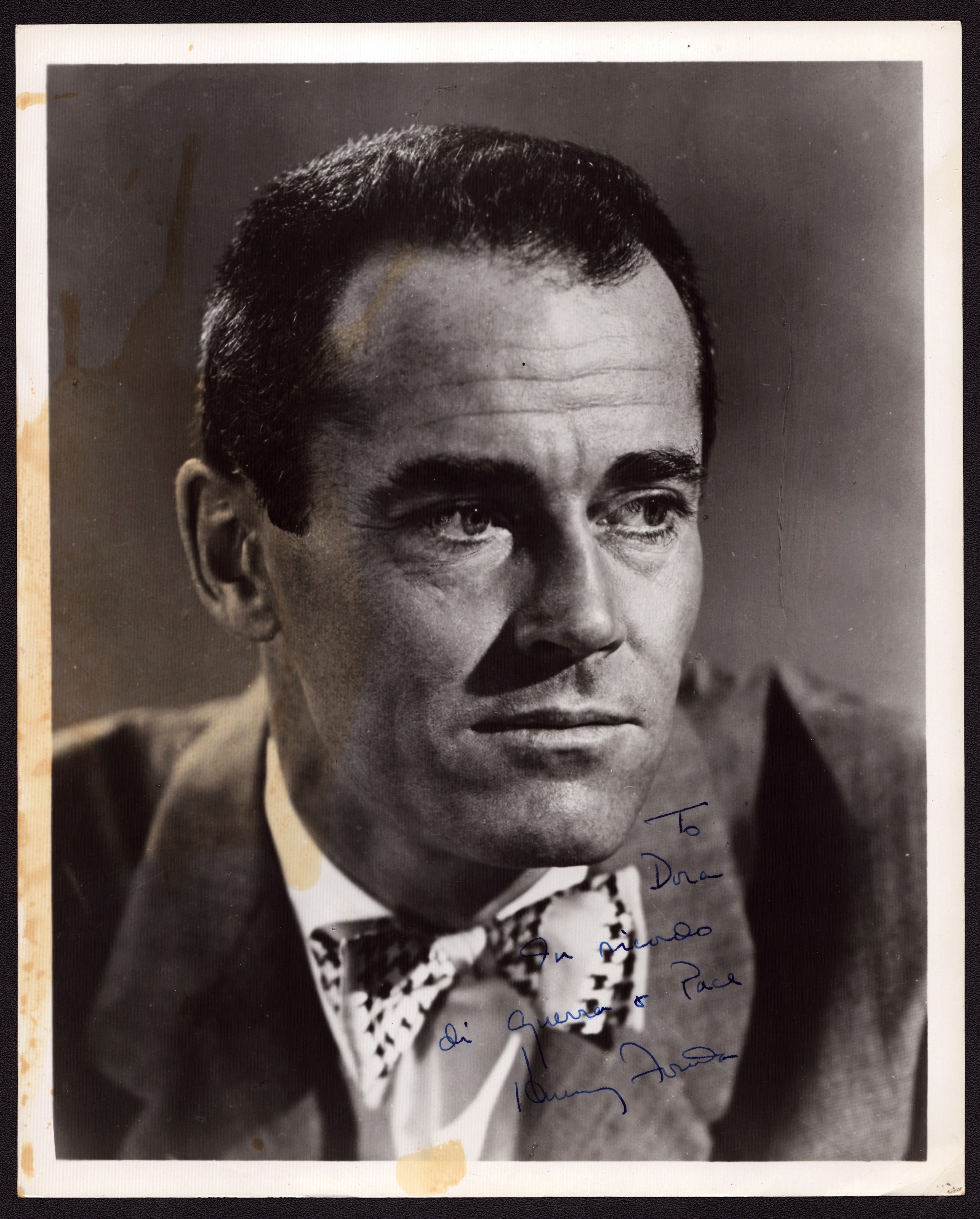Henry Jaynes Fonda (Grand Island, May 16, 1905 โ Los Angeles, August 12, 1982) - Photograph on matte paper, black and white, with original dedication and autograph in blue ink. In fair condition, with a scattered stain on the left side. Measures approximately 21 x 26 cm.