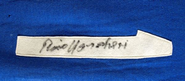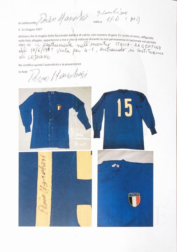 Shirt of the Italian national team from 1961-62 that belonged to Rino Marchesi and played in the Italy-Argentina friendly match on 15/6/1961 which ended with the result of 4 to 1 where Marchesi came on as a replacement for Lojacono. Light blue light wool shirt, long sleeves, applied felt and cotton shield, stitched felt number 15, ROMA and size 5 labels on the inside neck, Rino Marchesi's signature in black marker. Very good condition. Authentication certificate signed by the Mister himself is available