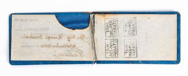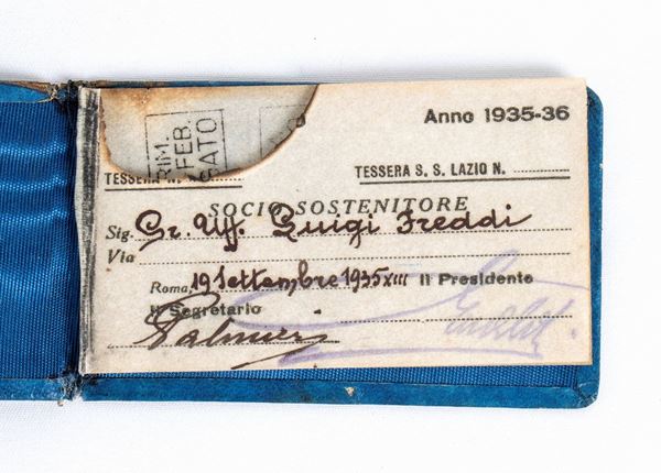 Card issued by SS LAZIO for the 1935-36 season, named for Luigi Freddi - Valid for access to the stadium, with light blue imitation leather cover, SS LAZIO shield emblem printed, signed by the secretary and the president (Erberto Vaselli?). Damage to the front cover and one page - Luigi Freddi (Milan, 12 June 1895 โ Sabaudia, 17 March 1977) was an Italian journalist and politician, known above all for having been first deputy secretary of the Italian fascis abroad, and subsequently one of the top leaders of Italian cinema politics in the second half of the 1930s and the beginning of the 1940s. He was the creator of Cinecittร .