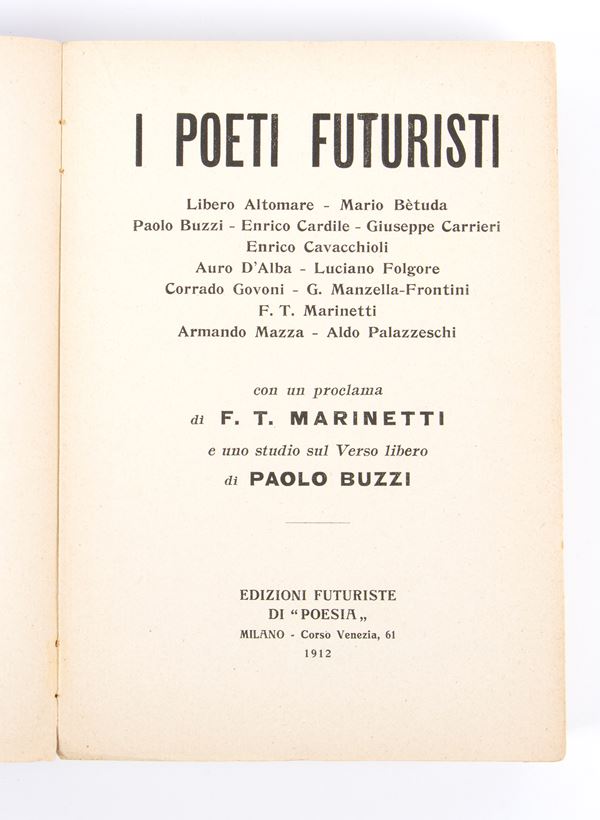 First edition, 1912, Futurist editions of Poetry, paperback, cover with black titles on a red background. On the silent front page we find a beautiful dedication with Marinetti's handwritten signature to the poet Artemisia Zimei. First anthology of futurist poets, with free-word and free-word compositions, edited by F.T. Marinetti (Alexandria, Egypt, 22 December 1876 โ€“ Bellagio, 2 December 1944). In excellent condition, cover with tear and missing spine at the bottom, ex-libris applied to the cover. 430 pages (6). Measurements approximately 20x14.5 cm