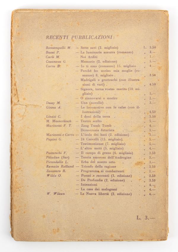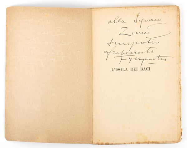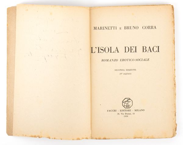 Erotic-social novel. On the silent front page we find the dedication with original autograph by Filippo Tommaso Marinetti, written in black ink. The island of kisses is Capri. Volume in fair condition, scattered signs and wear on the spine, tear on the back cover, used with some pencil notes by the futurist poet Zimei (a close friend of Marinetti) - In 16ยฐ, paperback printed in wine color on the plates and spine ( L. Venna), pp. 164 - 2nd edition 1919 - Facchi Editore Milan