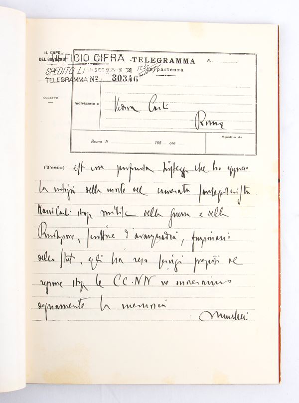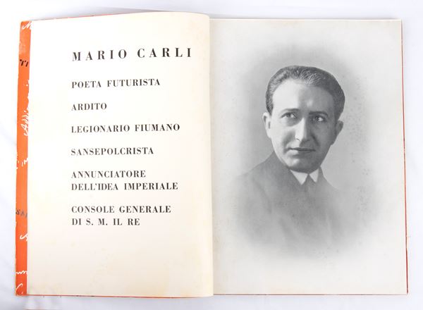 Volume published by Novissima in 1937, Filippo Tommaso Marinetti on "MARIO CARLI BOLD FUTURIST POET FIUMAN LEGIONARY SANSEPOLCRISTA ANNOUNCER OF THE IMPERIAL IDEA CONSUL GENERAL OF HM THE KING" Red editorial paperback binding, 80 unnumbered pages with 1 portrait of Carli. Measurements approximately 32 x 23 cm -