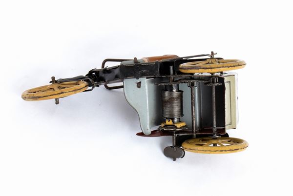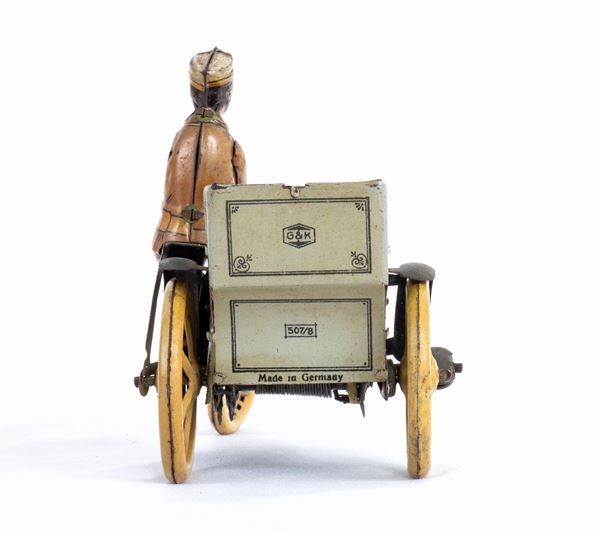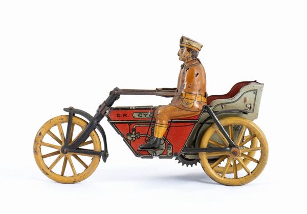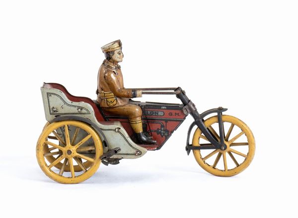 Lithographed tin toy, CYCLON model motorbike as lithographed on the petrol tank, complete with sidecar and driver. Wind up mechanism. Marked on the back G&K 507/8 Made in Germany, circa 1925