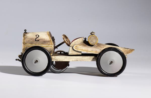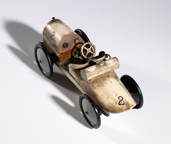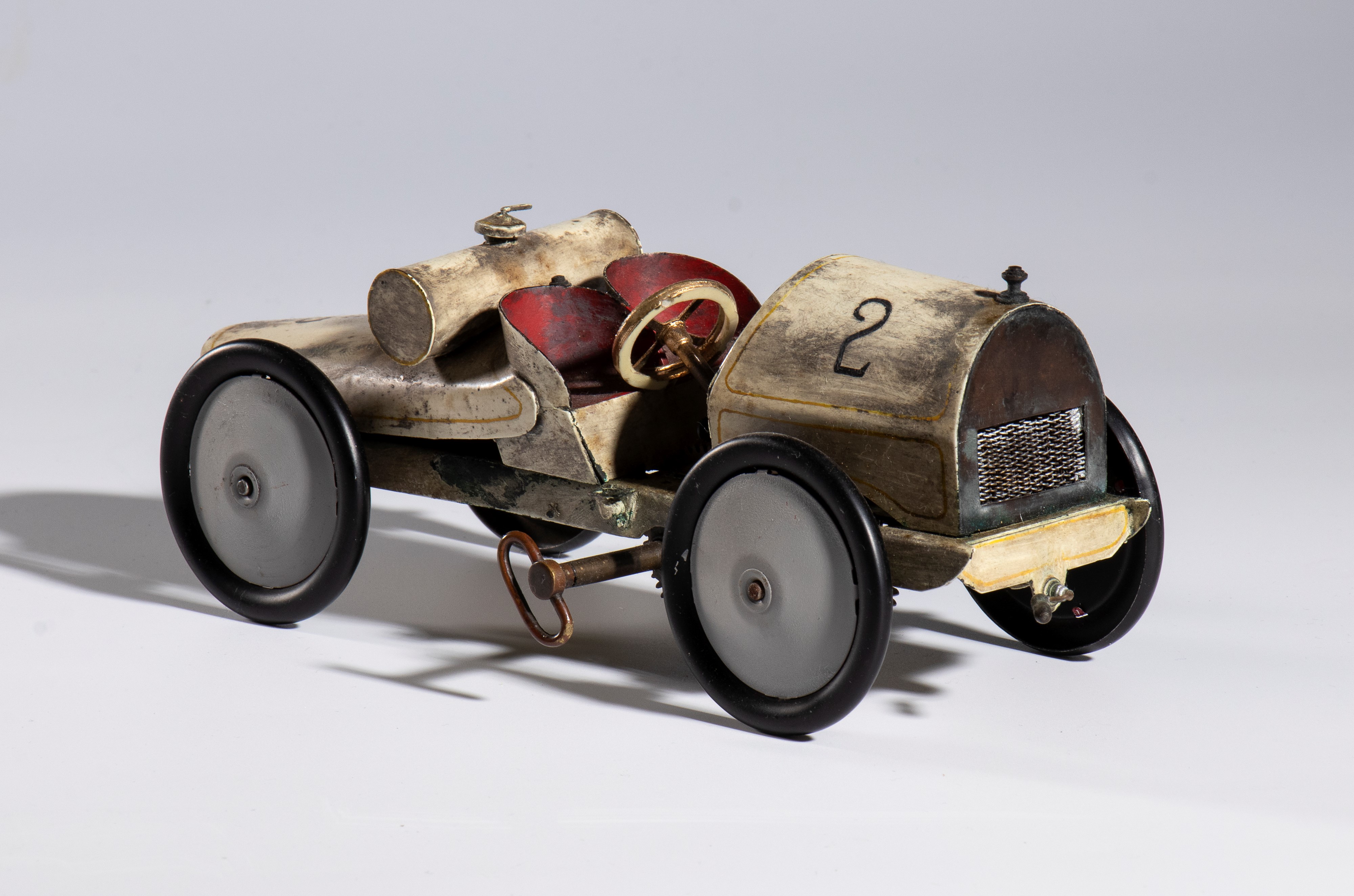Tin racing car, model inspired by the cars competing in the Gordon Bennet Cup in the early 1900s. Made in the mid-1900s, the brand is unidentified, likely French. Equipped with a spring-loaded motor, but it does not work.
