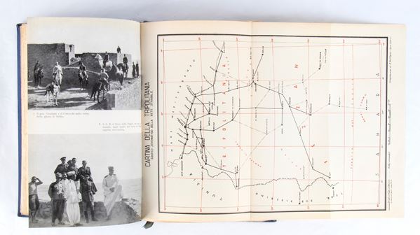 Volume entitled "The reconquest of Fezzan", Mondadori, 1934, XIII E.F. , with blue hard cover with gold-like lettering on the cover and spine, retains the original paperback cover and dust jacket, with blue cardboard slipcase. On the frontispiece there is an autographed note by General Rodolfo Graziani, written in green ink, which reads "Graziani Rodolfo - Binding done during the Procida prison - Year 1946"