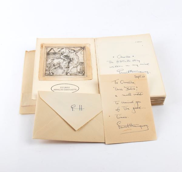 The book "49 racconti," with an ex-libris "Arnaldo Zamperetti" on the frontispiece, features Hemingway's dedication and handwritten signature to Ornella Zamperetti: "*ORNELLA* The fiftieth story written in my mind - Ernest Hemingway."
