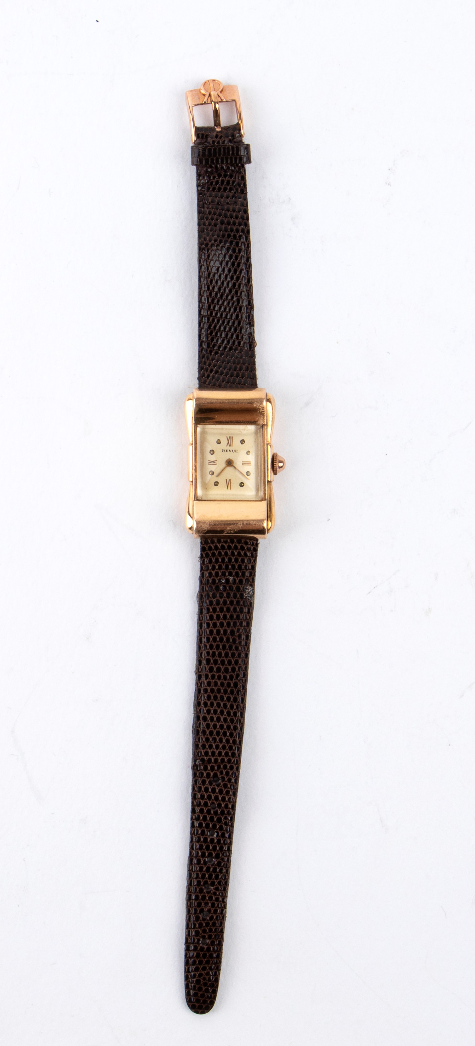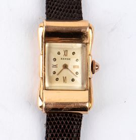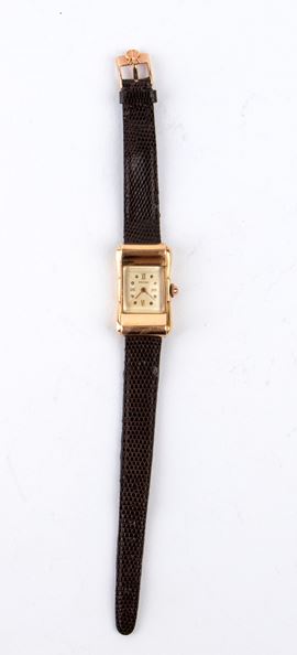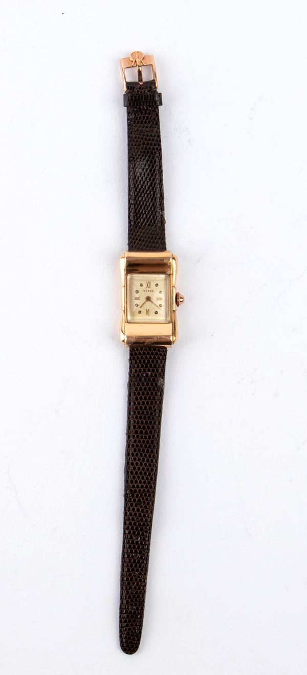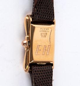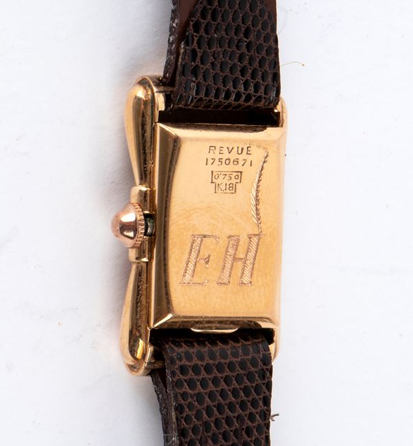 The Revue wristwatch, reference 1750671 in 750 18K gold, in its original box, bears the initials E.H. engraved on the caseback and a quill pen, the writer's symbol. The watch comes with an envelope signed E.H. and the handwritten note that reads, "September 48 To Ornella 'Miss Italia' a small watch to remind you of the good times. Ernest Hemingway."