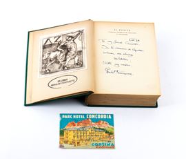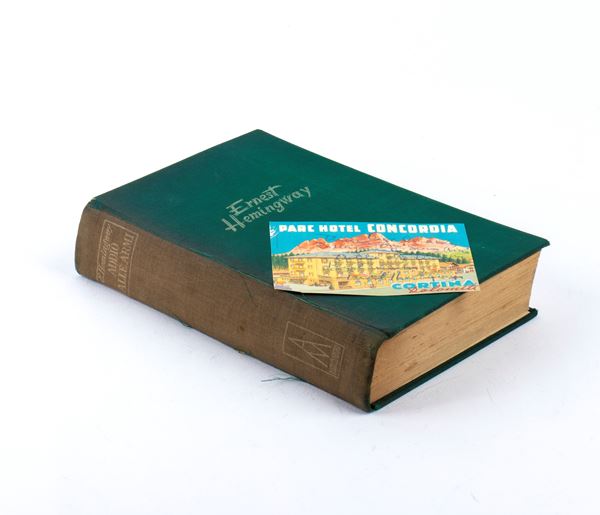 Lot consisting of a volume entitled "A Farewell to Arms" with a dedication and handwritten signature by Ernest Hemingway, and a Hotel CONCORDIA luggage tag with a message and handwritten signature by Hemingway.