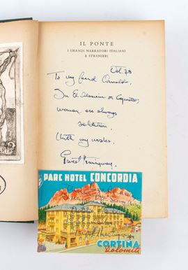 Volume "A Farewell to Arms" Arnoldo Mondadori edition, cloth cover, Ex-Libris applied to the frontispiece, dedication and handwritten signature by the writer: "Oct. 48 - To my friend Arnaldo, in El Alamein or Caporetto, woman are always salvation. With my wishes, Ernest Hemingway."