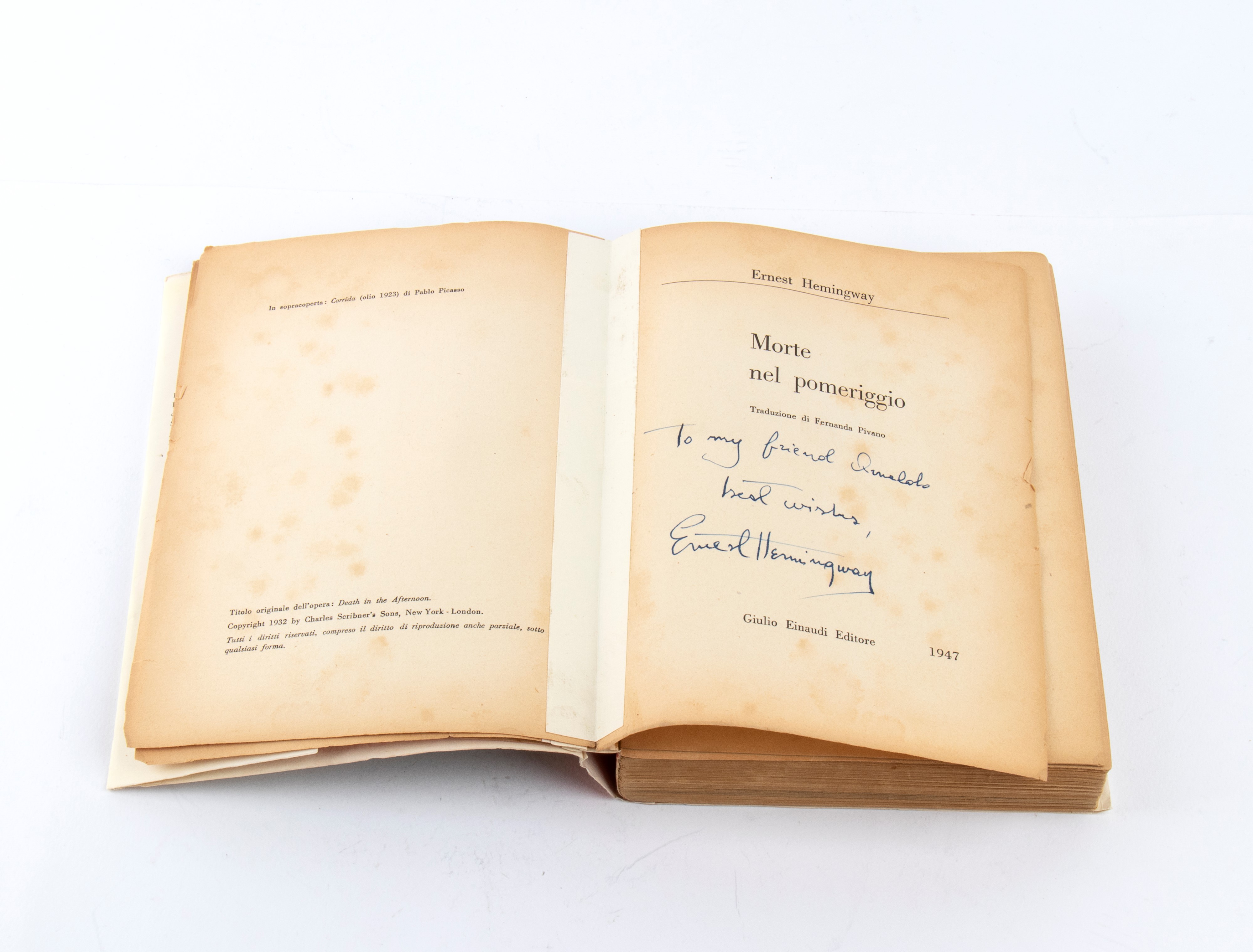 Volume "Death in the Afternoon," Italian edition, EINAUDI, 1947, cover with dust jacket, dedication and handwritten signature by the author, "To my friend Arnaldo - Best wishes, Ernest Hemingway."