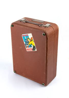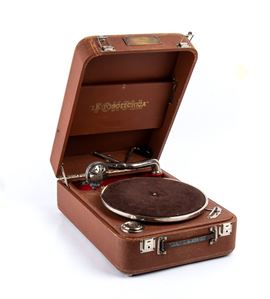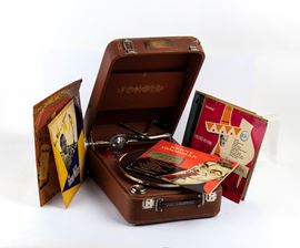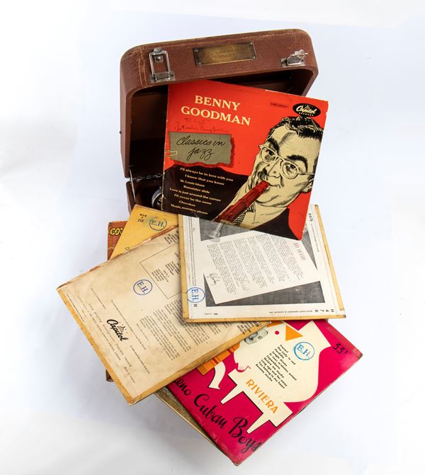 Lot consisting of a portable gramophone that belonged to Ernest Hemingway and a set of eight 10" vinyl records.