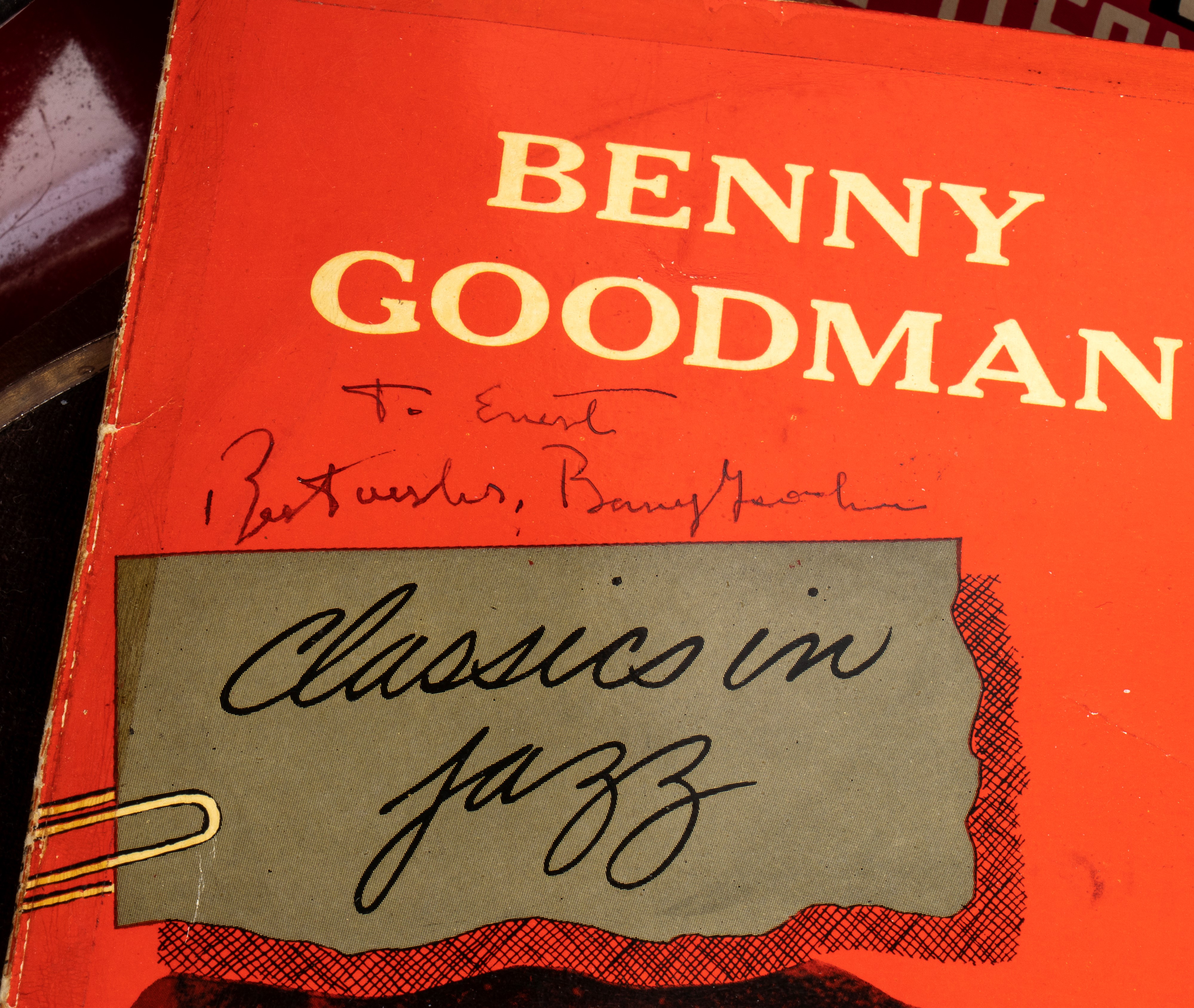 The eight 10" vinyl records, jazz in style, all personalized with the initials E.H. within a circle, stamped on the covers, one of which is autographed by musician Benny Goodman with the dedication "To Ernest - Best wishes - Benny Goodman."