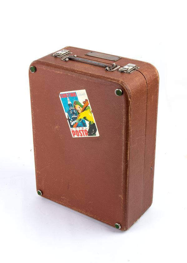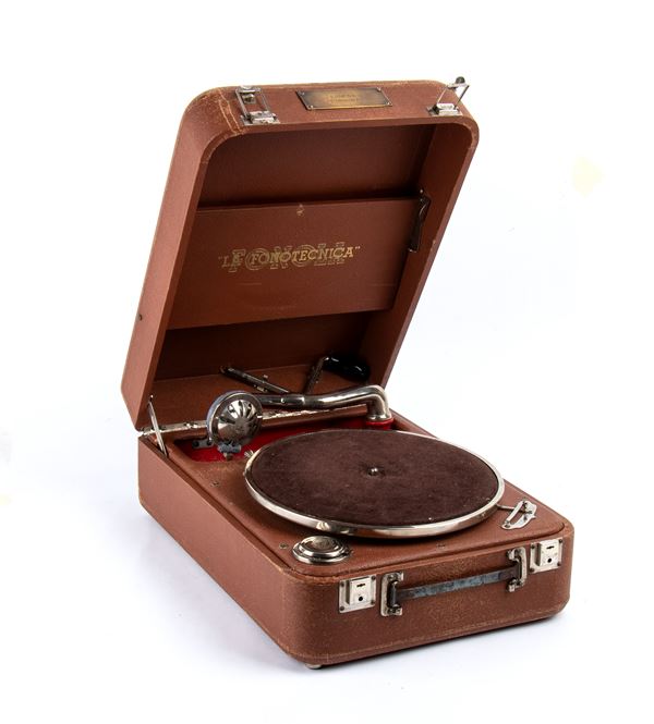 The gramophone is a portable FONOLA model LA FONOTECNICA, complete with a fold-out case in wood with a leatherette cover, featuring a carrying handle. On the front of the lid is a brass plate engraved with the name ERNEST HEMINGWAY. The case also features a plaque advertising the Hotel Posta in Cortina.