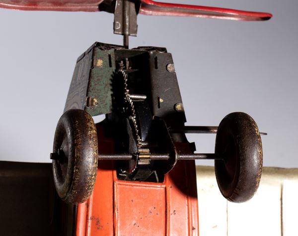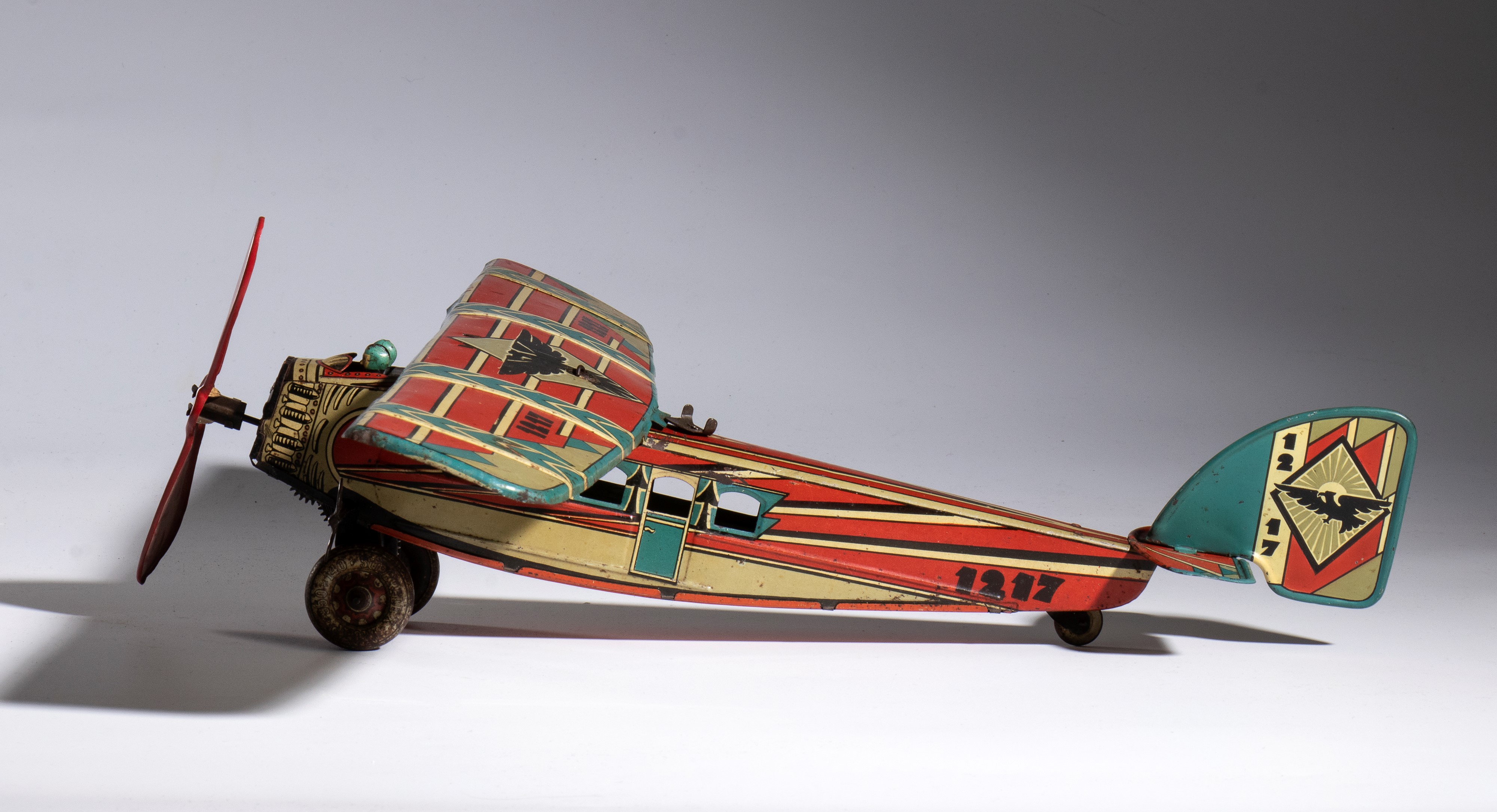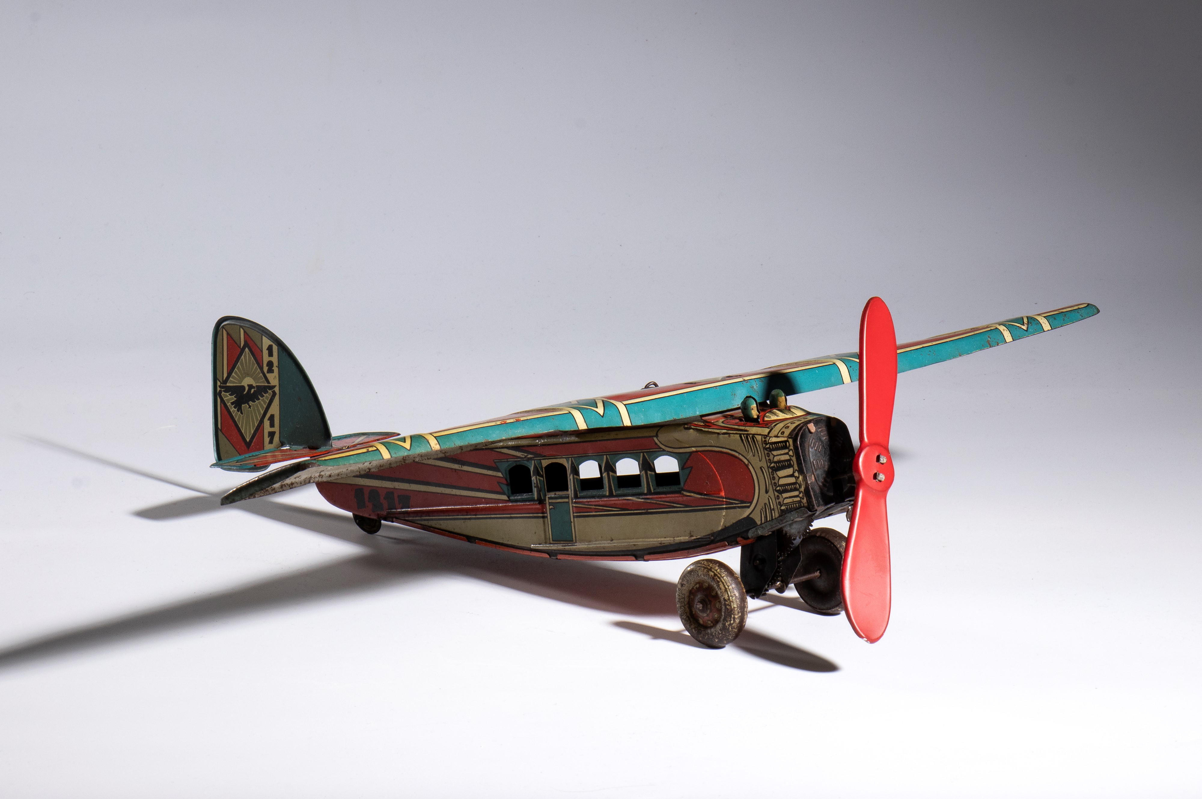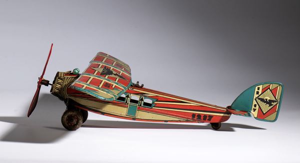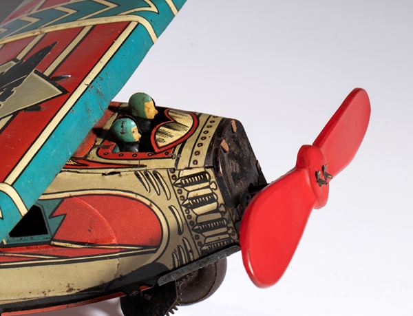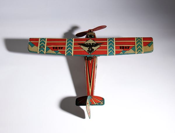 Lithographed tin airplane model 1217 with futuristic livery, imperial eagle with open wings on the wings and on the tail rudder - Working spring wind-up. In good condition, signs of aging, scattered oxidations. Measurements approximately 50 cm wingspan, 40 cm length