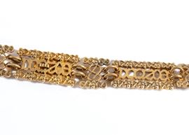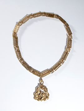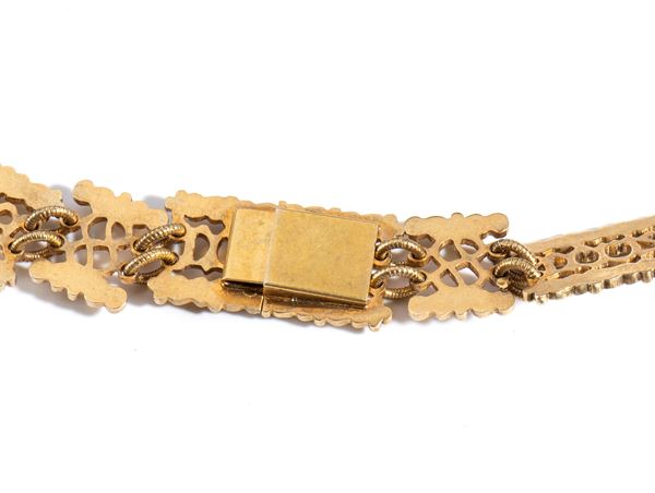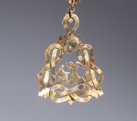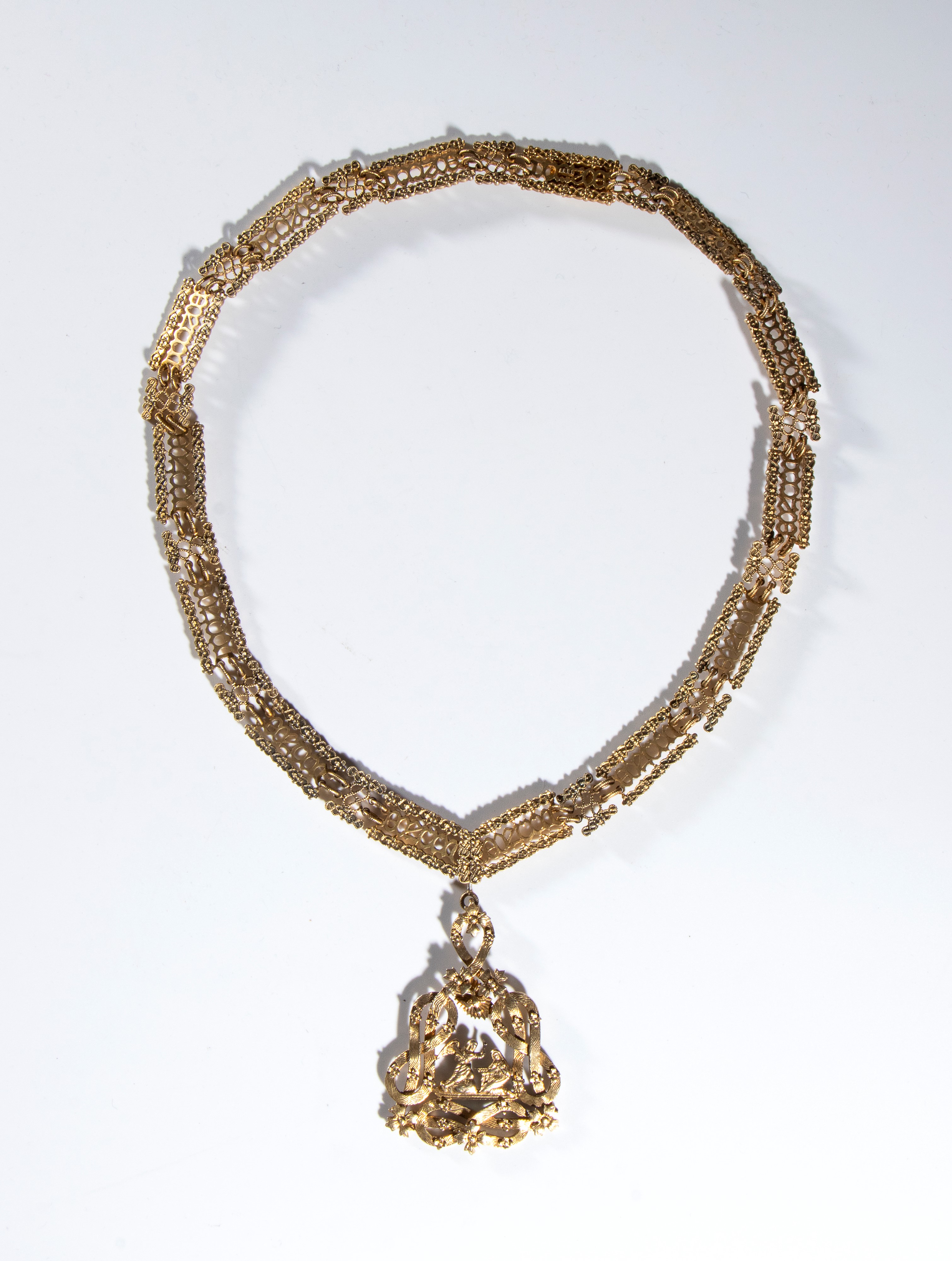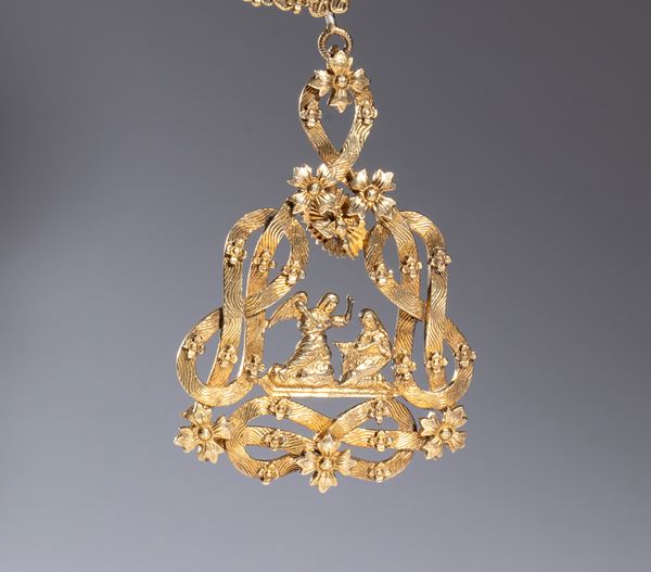 Small necklace with pendant of the Santissima Annunziata, gilded silver, refined and precise workmanship by CRAVANZOLA, late 19th/early 20th century. Composed of 14 elements bearing the inscription FERT, linked with 13 small connecting elements with Savoy knots, with a clasp.