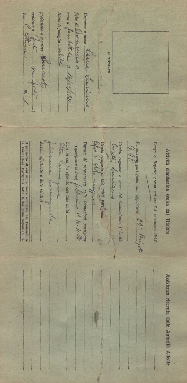 Identity card document of Luciano Lama, from the municipality of Forlì, year of issue 1948, with original Lama's signature. With postmarks, mediocre condition, card divided into two pages, central tear, stains. Measurements 10.5x7 cm