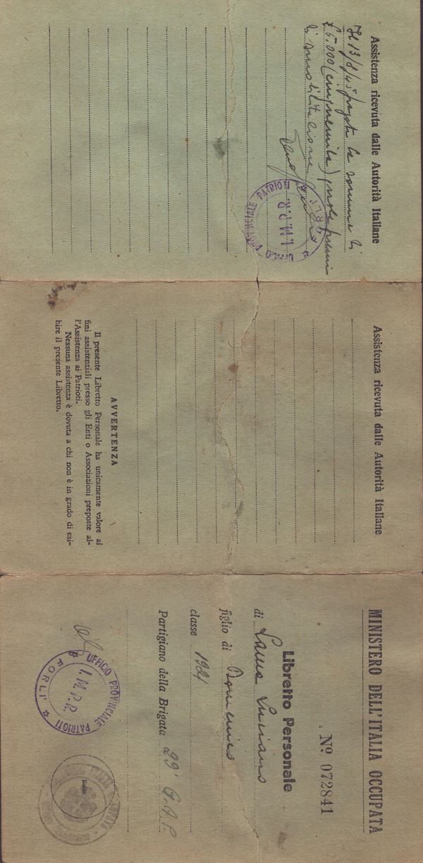 Personal booklet of Luciano Lama, issued by the MINISTRY OF OCCUPIED ITALY, by the Provincial Patriots Office of Forlì, for the PARTIGIAN OF THE 29th G.A.P. BRIGADE. - Booklet in green cardboard, in three sections, with the data of CLANDESTINE ACTIVITY CARRIED OUT BY THE OWNER, graduated as CHIEF OF STAFF of the brigade to which he belongs. Central tear, restored. Mediocre conditions. Measurements of each section cm. 11x16