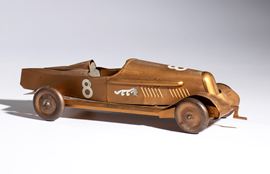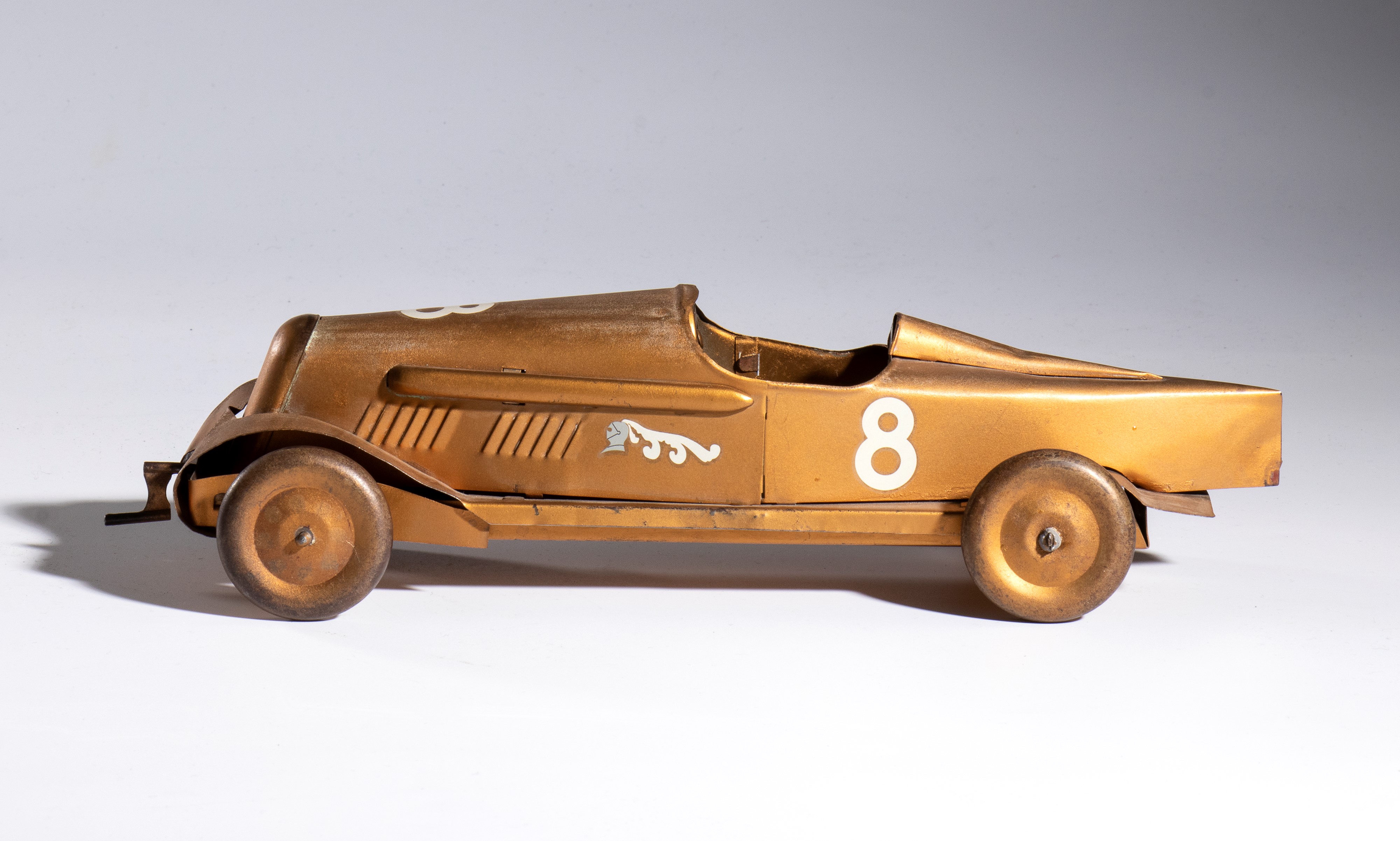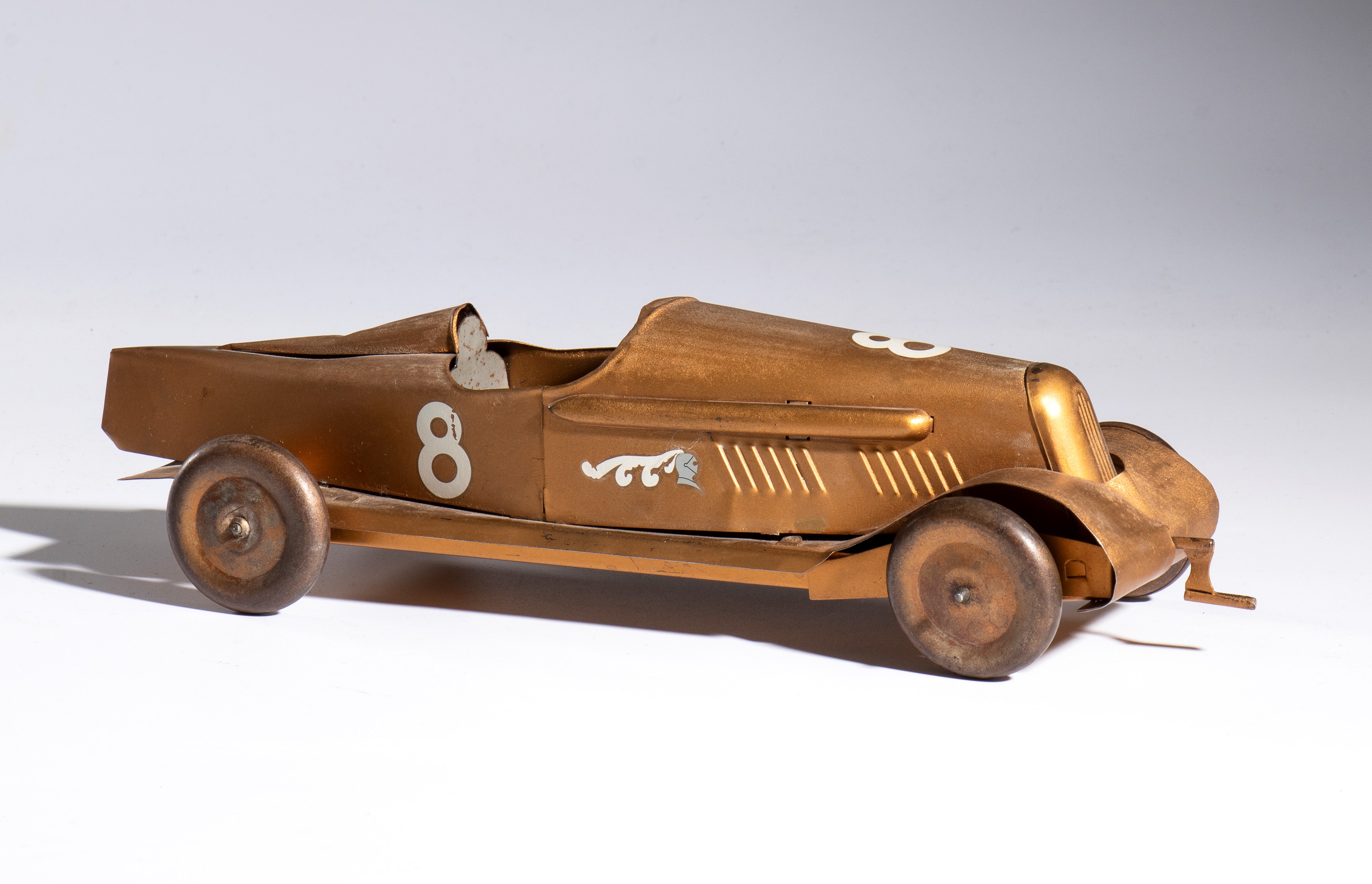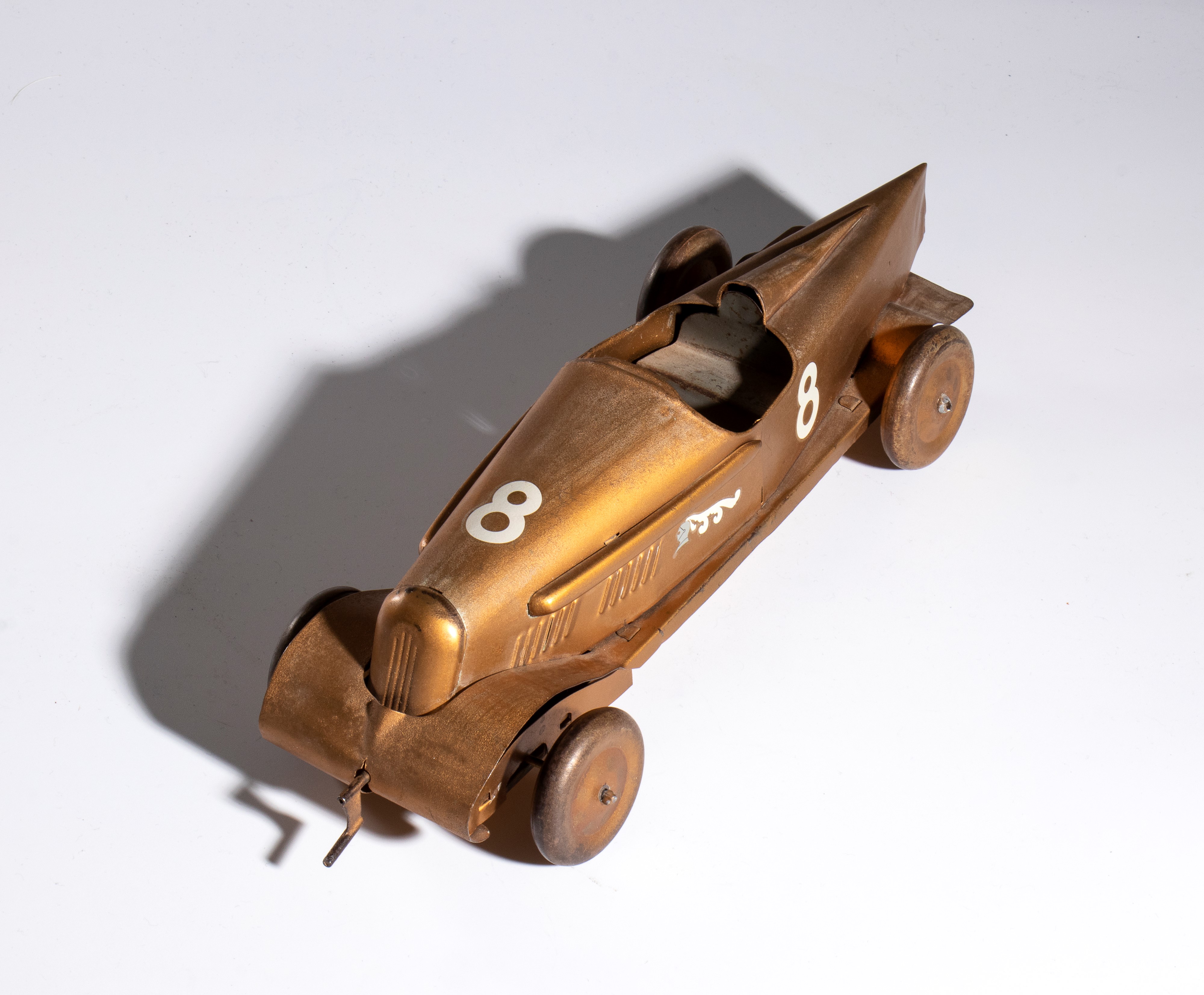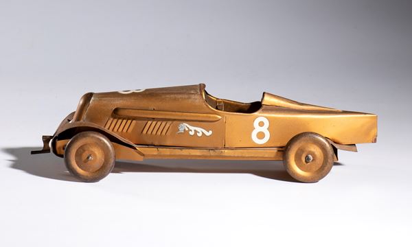 Tin racing car from the 1930s, LE MOTEUR GUY, illegible stamped logo on the bottom. MADE IN FRANCE, equipped with a front-mounted crank spring, under the radiator, operation needs to be checked.