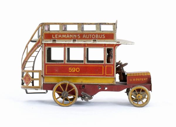 Bus EPL 590 LEHMANN'S BUS. in lithographed tin, with wind up mechanism, ladder leading to the upper deck of the bus. One of the most popular LEHMANN toys. Marcato, D.R.G.M. with EPL logo. 910s