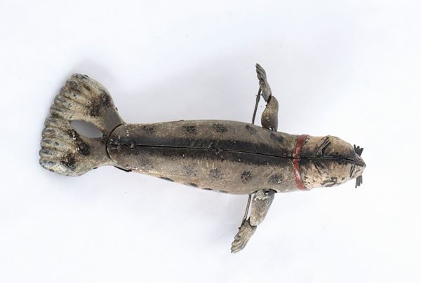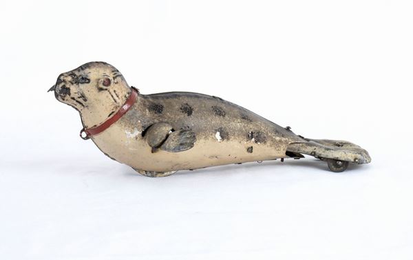 Lithographed tin seal, 1900-1930, wind up, tail and front flippers that move simulating the movement of the cute marine mammal. Marked DRGM DEUTSCH ARBEIT Made in Germany with EPL LEHMANN logo on the tail. In 1900, the toy was marketed as "The Performing