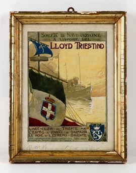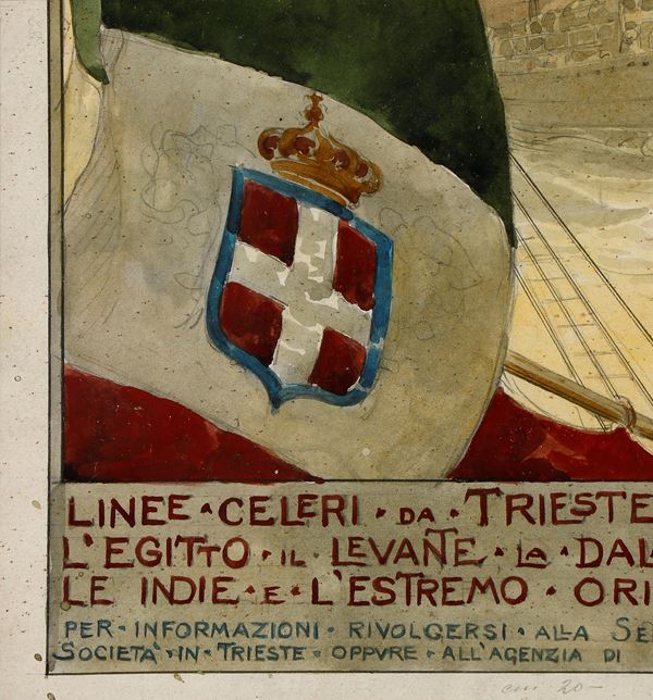 Advertising sketch of LLOYD TRIESTINO - SOCIETA' DI NAVIGAZIONE A VAPORE - Fast Lines from Trieste to Egypt, the Levant, Dalmatia, the Indies and the Far East. Watercolor on cardboard, original. Size approximately cm. 23 x 32, in a period frame. Good condition