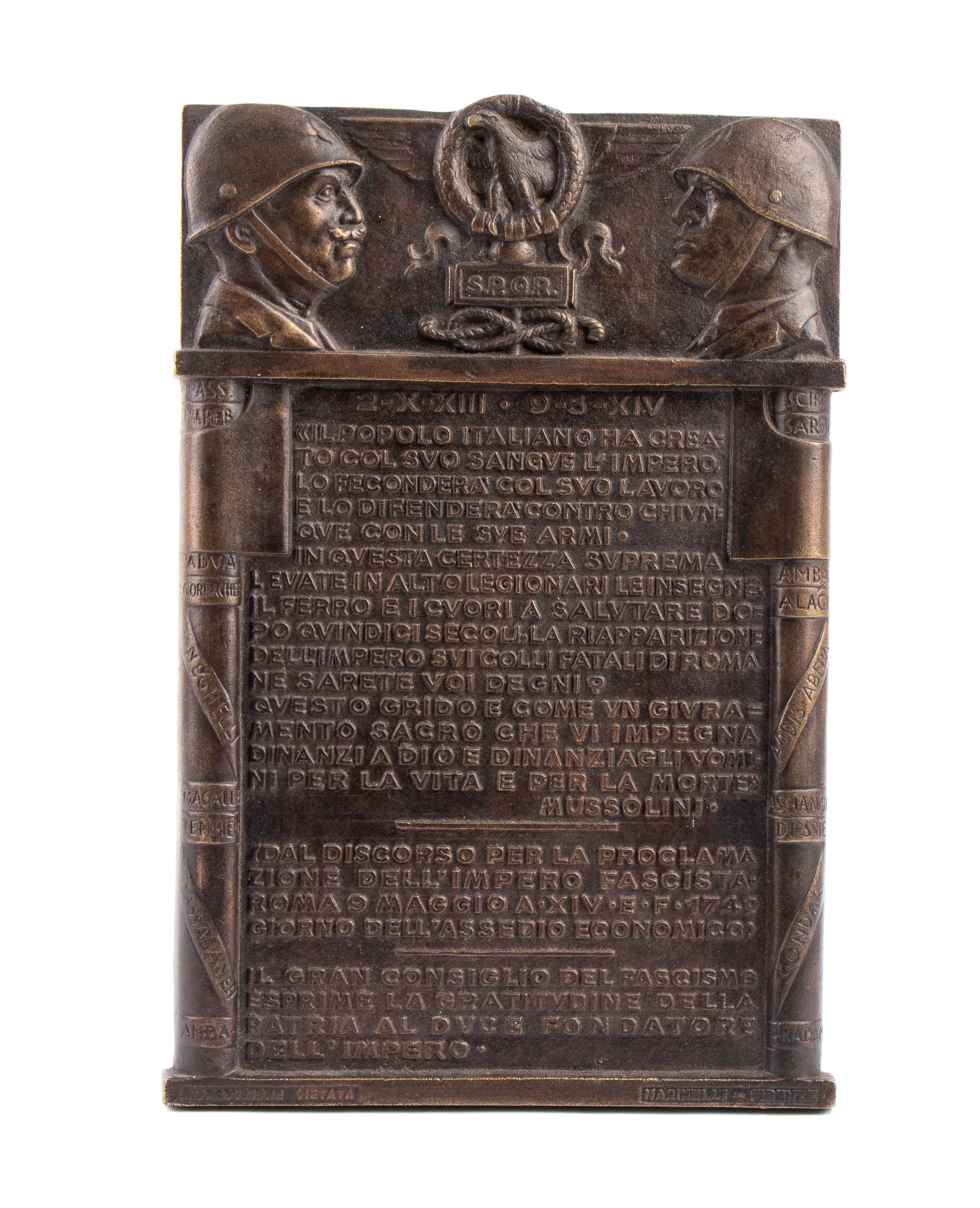 Bronze plaque commemorating the proclamation of the Fascist Colonial Empire.