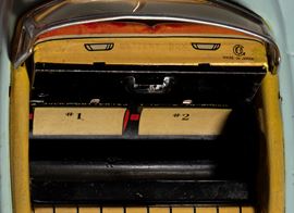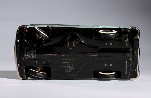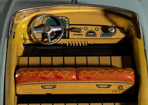 Battery-operated (battery compartment under the front seat, which folds down to allow battery insertion). Motor with forward and backward motion. Electric lights with controls on the dashboard.