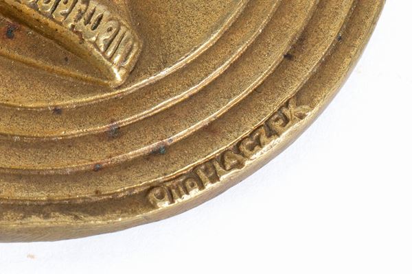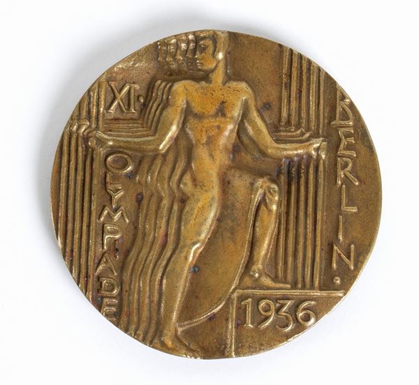 A 1936 German Olympic Games Participants Medal Bronze. Awarded to participants to commemorate the 1936 Berlin Summer Olympics. The obverse of the medal features five men standing in line stepping onto a podium inscribed “1936”. On the left side “XI. OLYMPIADE” and on the right side “BERLIN”. The reverse of the medal features a bell with an eagle holding the Olympic rings at the centre, signed “OTTO PLACZEK” on the ledge. Rim marked with the foundry maker Guss Noack Berlin. Patina of time, good condition