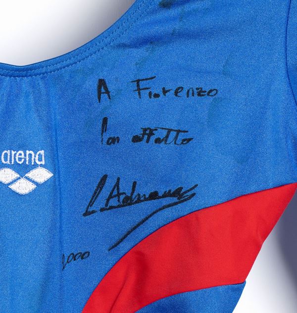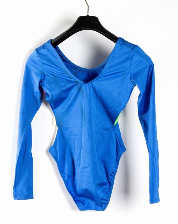 Long-sleeved bodysuit in light blue jersey with tricolor designs, marked ARENA, free body gymnastics, with dedication signed in black marker by ADRIANA CRISCI. Minor scattered stains, used