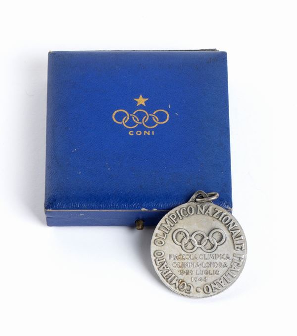 Medal for the torchbearers of the Olympic Torch route for the 1948 London Olympics. ITALIAN NATIONAL OLYMPIC COMMITTEE - OLYMPIC TOrch - OLIMPIA LONDON 15-29 JULY 1948. Signed Manetti, in original Stabilimenti Artistici Fiorentini box. Medal with slight damage to the edge, excellent overall condition