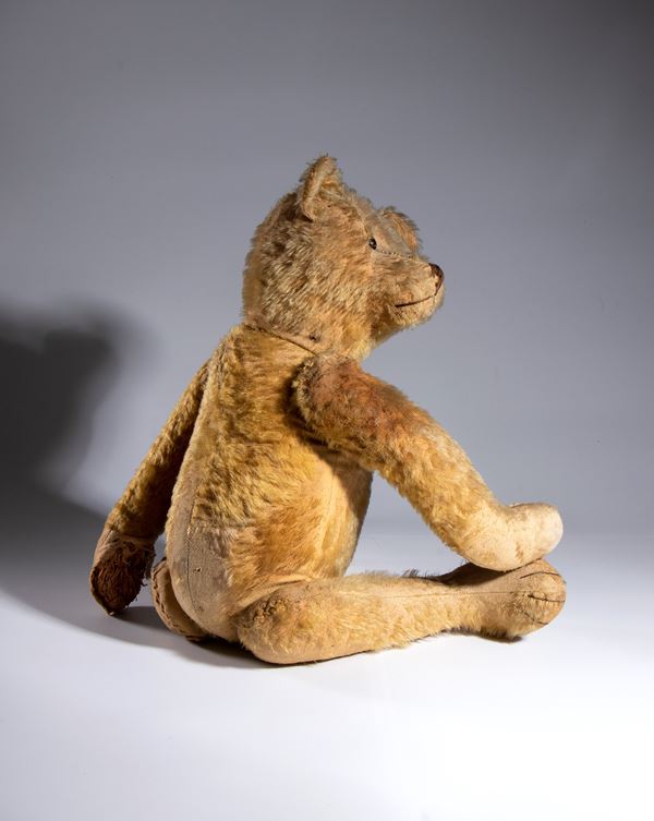 Straw stuffing, movable limbs and head, 3 claws per paw, button eyes. The mohair fur is missing, paw cloth with tears and moth holes.