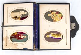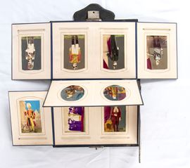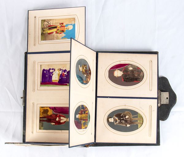 Precious album with a collection of 16 CDV format photos, watercolored, with portraits of Pope Pius IX, Cardinal Antonelli, soldiers of the Swiss Guard, Noble Guard, General Hermann Kanzler, Sword and Cape Waiter (Secret Waiter of His Holiness), papal nobility, prelates. The photos are original from the time, some signed on the back. They measure on average 9x6 cm each, they are collected in an album which, when opened, acts as a searchable display. Rigid structure in wood and cardboard, with shortcomings.