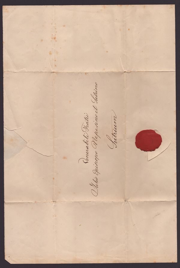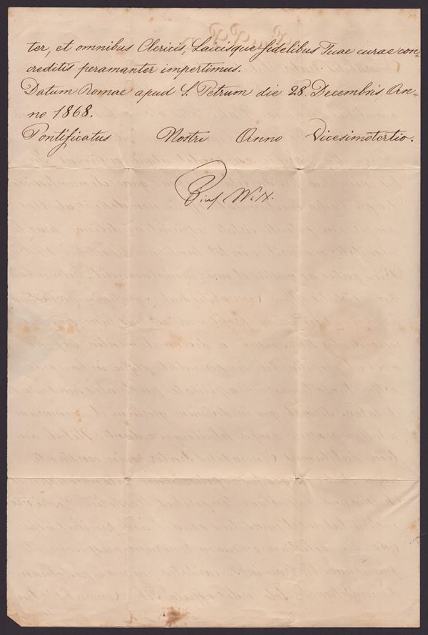 SS Pope PIUS IX, letter of one page and 5 lines on a 4-page sheet, autographed by Pope PIUS IX with original signature at the bottom, black ink, dated 28 December 1868. Complete with recipient's heading with sealing wax stamp. Creases on the sheet, two slight tears that do not affect the legibility of the manuscript, dimensions of the open sheet approximately 23x32 cm. Excellent condition