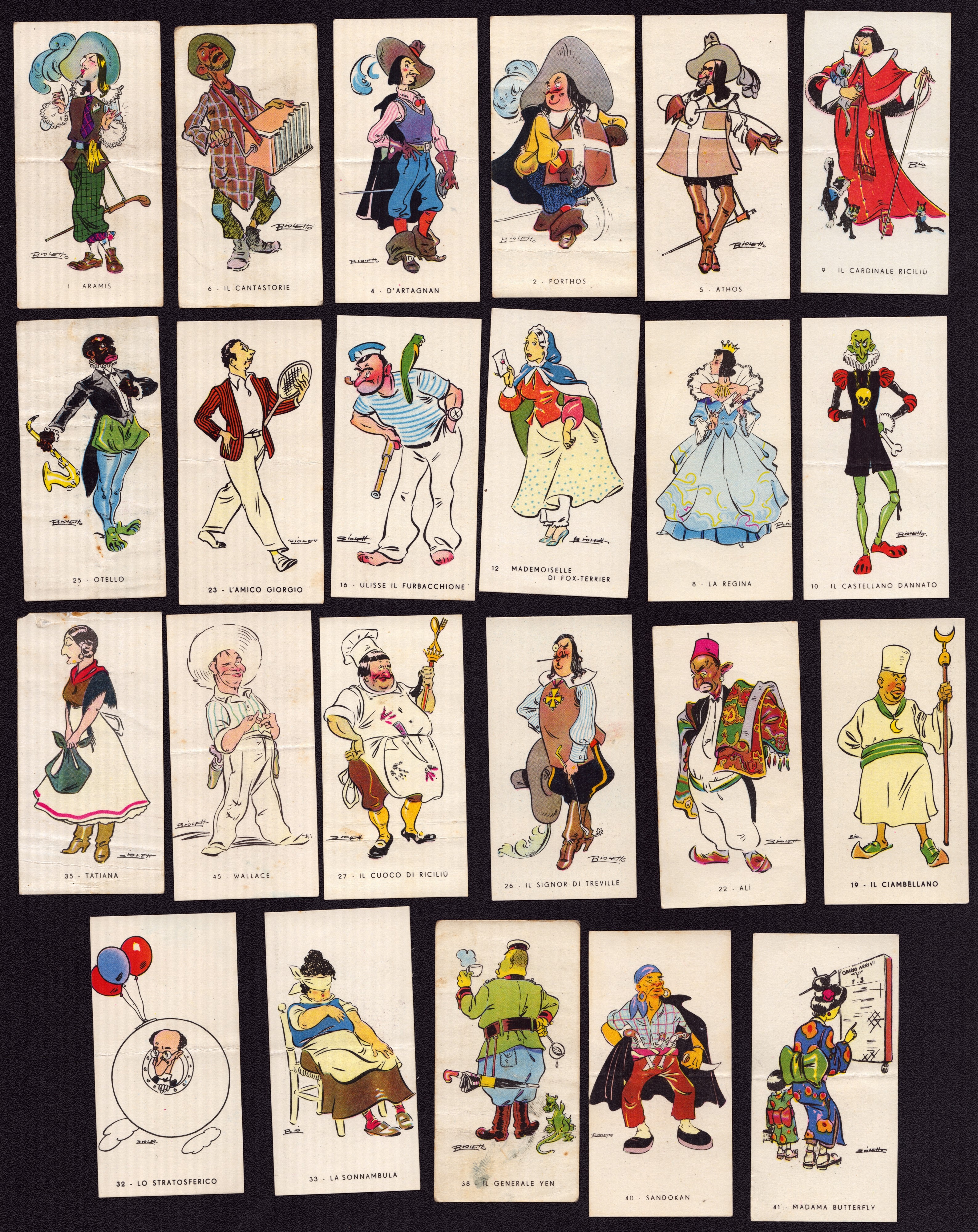 Lot of 23 stickers from the BUITONI PERUGINA collection titled THE FOUR MUSKETEERS, 1934. The stickers were not recovered from albums, so they show no signs of previous gluing. They are otherwise in good condition, with slight creases in the center and at the corners, due to age and storage.