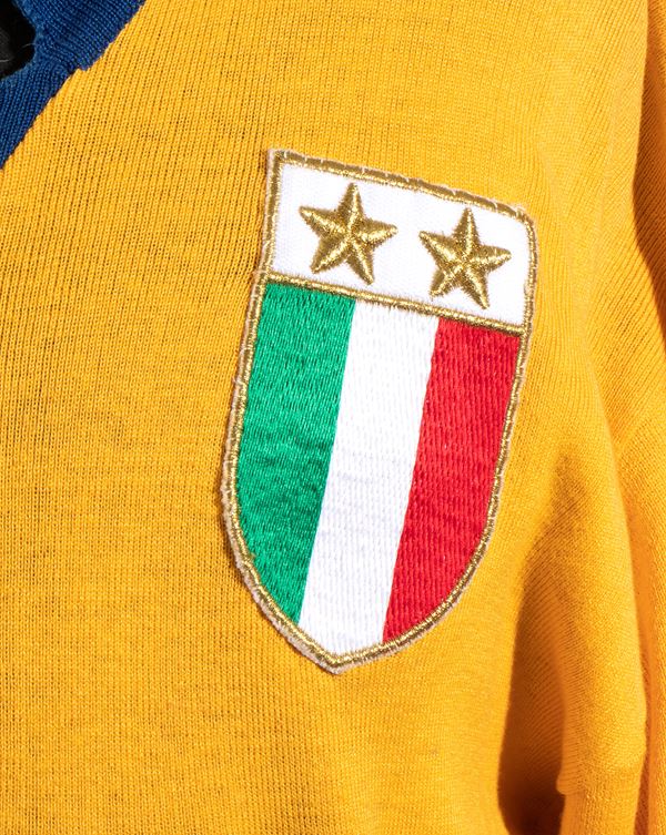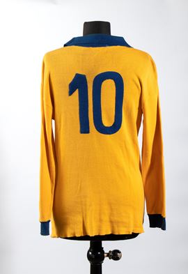 Long-sleeved away jersey, yellow with blue cuffs and collar, made of cotton or heavy acrylic. Remnants of the label on the inside collar. Estimated size L