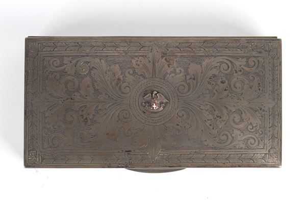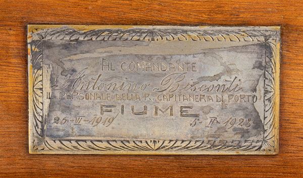 Cigar case, in silver marked 800, with floral engravings in burin, bearing the coat of arms of Fiume with the eagle with open wings (with a single head) above the INDEFICENTER cartouche with a white and red enameled shield on the chest. Inside the lid a silver plate engraved with the dedication TO COMMANDER ANTONINO BISCONTI THE PERSONNEL OF THE ROYAL CAPTAIN'S OFFICE OF PORT - FIUME - 26 VI 1919 - 5 II 1928. Excellent condition